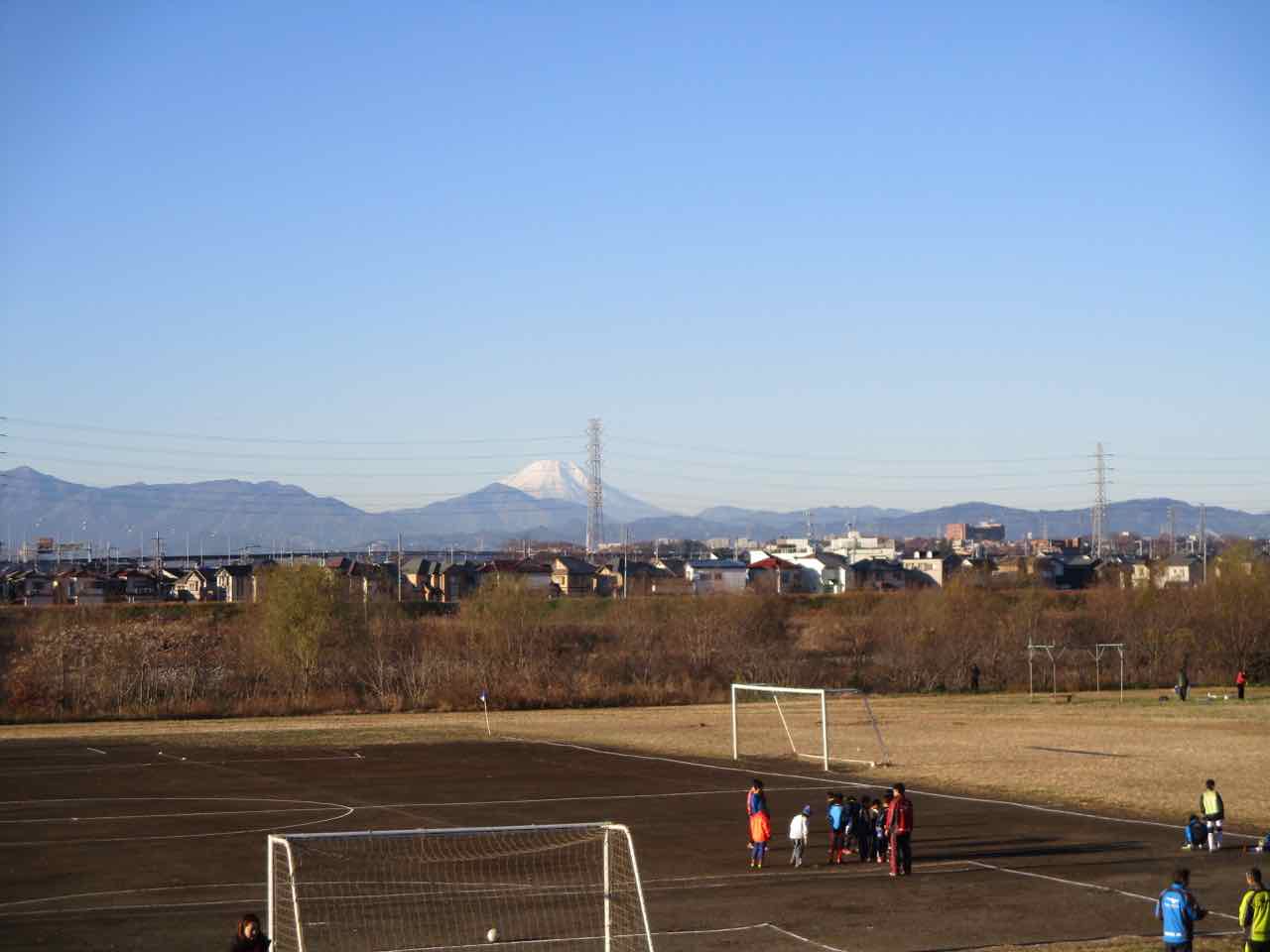 京王閣のあたりから多摩川サイクリングロードを走る。立川あたりで一度サイクリングロードが切れるのだけど、以前はそこまでの往復が週末のサイクリングコースだった。写真はその折り返し地点にしていたグラウンド。向こう側に小さく富士山が見える。何度も来てたのに、今日まで知らなかった…。 ^^;
