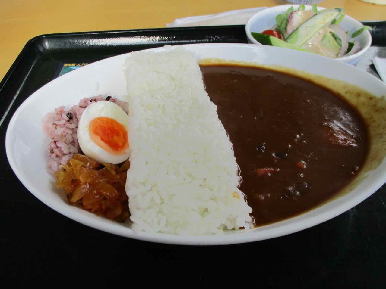 ちょうどお昼時だったので、まずは腹ごしらえ。薬膳料理や鹿肉料理など、美味しそうな料理はいろいろあるが、オリジナルカードがもらえるとなれば、 "日吉ダムカレー" を食べないわけにはゆかない。 ^^; さすがはダムカレー! ご飯がダムになってる!! ^^