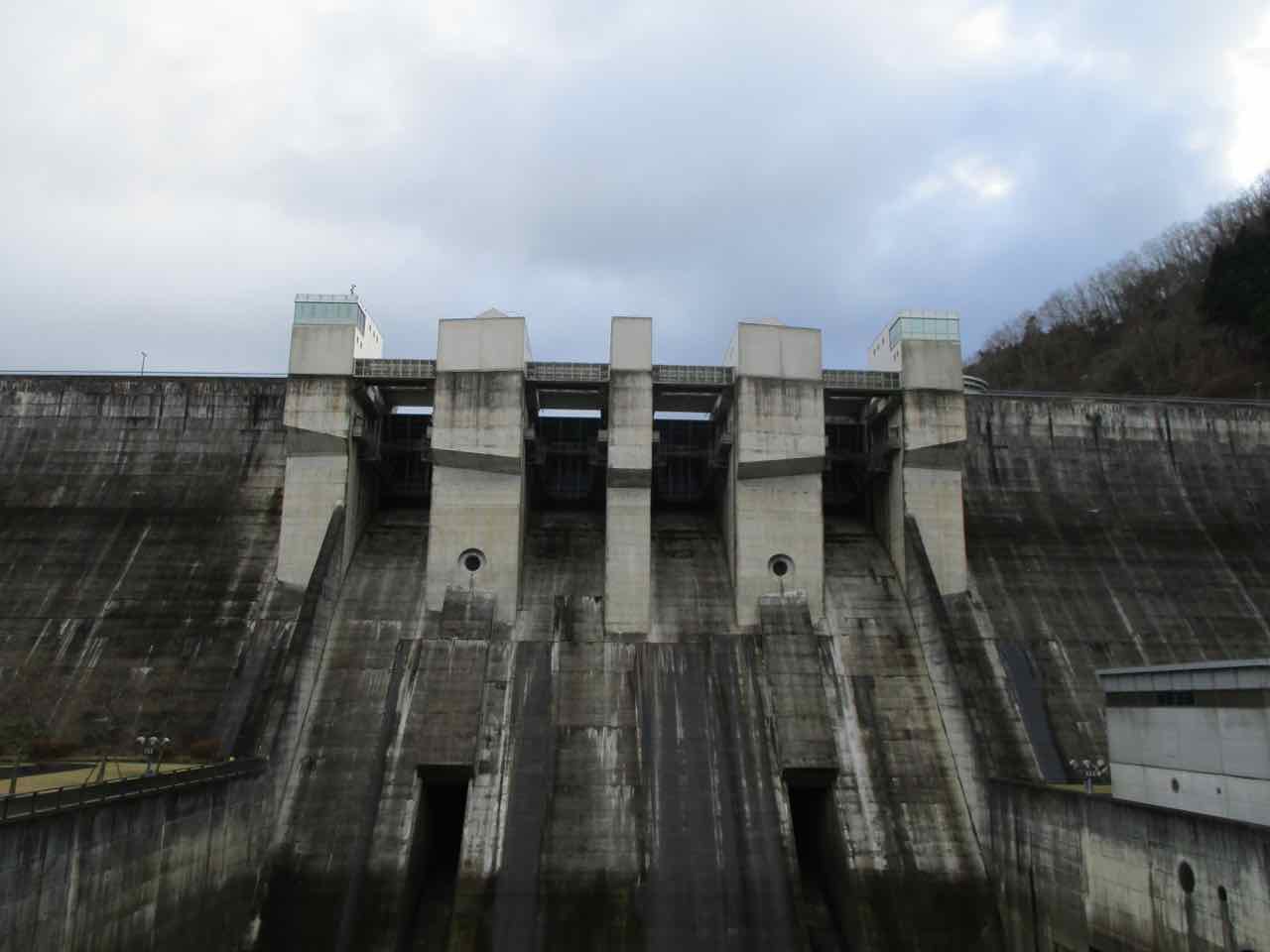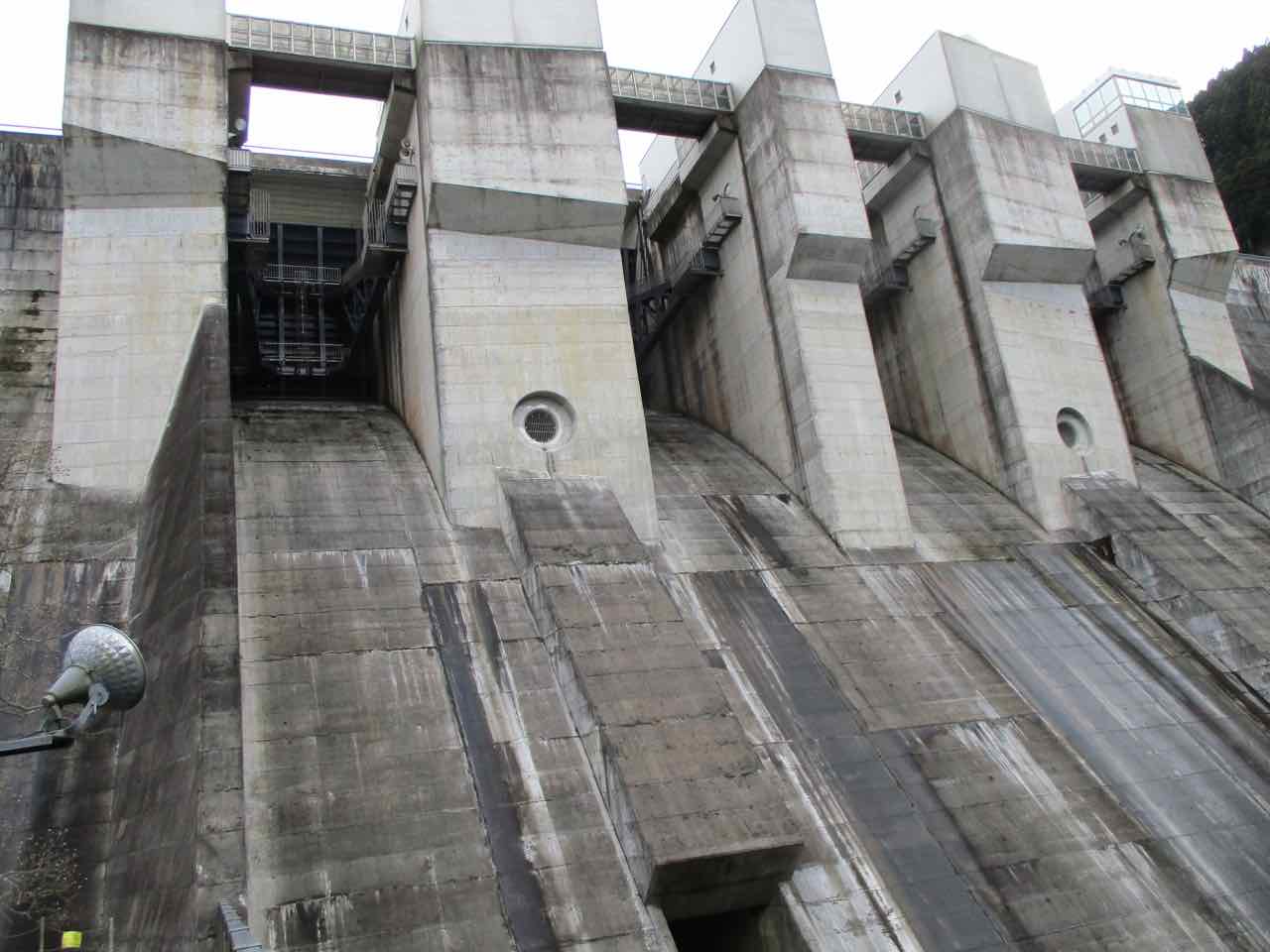ダムの側まで来ると迫力満点。「この壁の向こう側には湖があって、今いる場所は水底なんだよなぁ〜」などと想像すると、畏怖してしまう。その一方で、マジンガーゼットでも出てきそうな秘密基地を思わせる雰囲気も漂っている。 ^^;