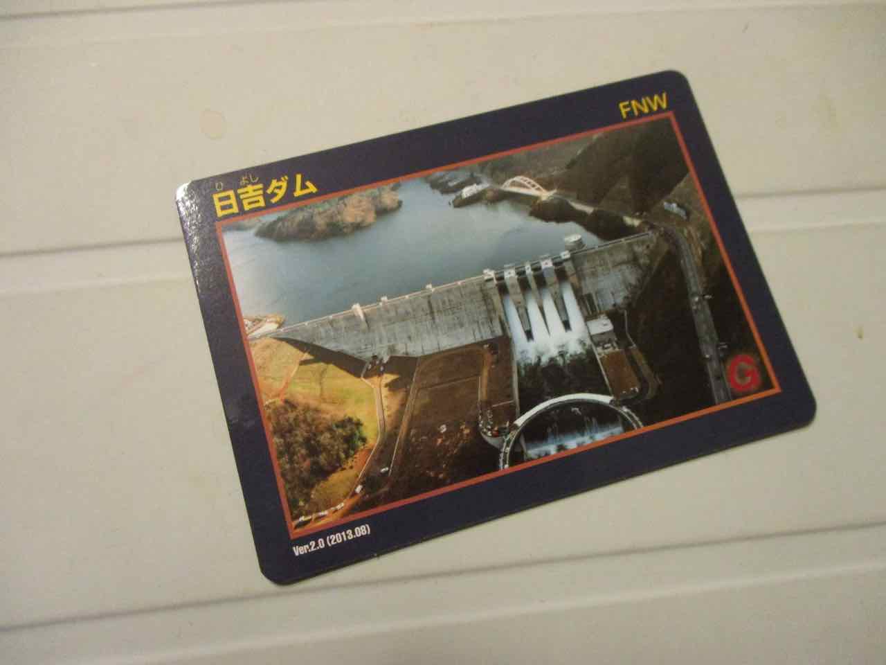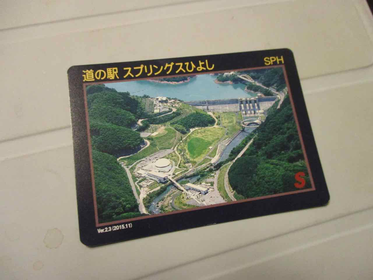 プレゼントされたオリジナルカードがこれ。実は「やったぁ! ダムカード獲得!! ^^」と思っていた。が、ネットで調べると、ダムカードは日吉ダムでも管理事務所で配っているとのこと。裏面を見ると、ダムと温泉のスペックが書いてあり、どうやら "道の駅カード" とでも呼ぶべきもののようだ。 ^^;