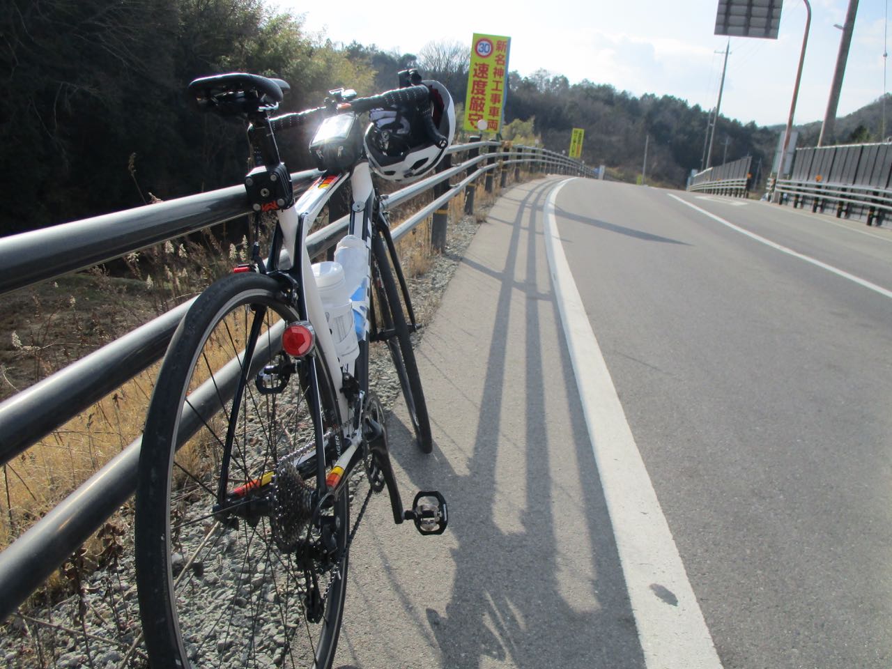 去年、積み残した唯一の宿題である大野山。登坂口からいきなり 13% ぐらいの斜度で始まる激坂だが、秋からいくつもの山を登った今なら、きっと登れるはず。そう信じて、猪名川沿いを走って行く。大野山の標高は 753m だが、晴天で、 1 月にしては気温も高めなので、気持ち良く登れそうだ。