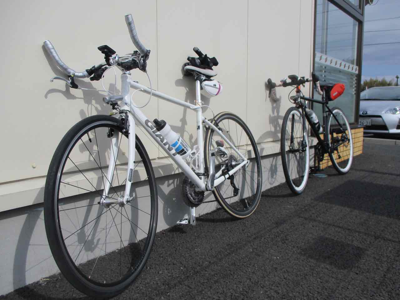 駅前のコンビニで、ブルホーン化した私の白い Escape Air と、コガさんの黒い新車を愛でながら、まずは、朝のコーヒーを。