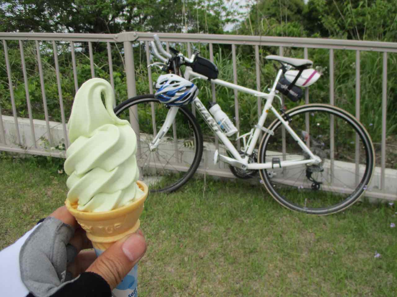 サイクリングといえば、ソフトクリーム。売店で目立っていた わさびソフトクリーム を頼んだら、ちゃんとワサビ味だった。^^; 鼻にぬけるツーンとくる辛味はないのだが、しっかりとワサビ味がする。でも、全体的には甘いソフトクリームだ。美味しいかどうかは好みの分かれるところだが、ワサビのスッキリ感はなかなか合うと思った。^^