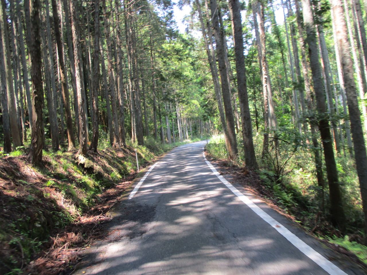 もう少し走ると、どう見ても林道。 ^^; 斜度 5% ぐらいの数キロのヒルクライムで、車はごくたまに通るぐらい。涼しくて、木漏れ日が幻想的なので、なかなかいい感じで快走できた。 ^^