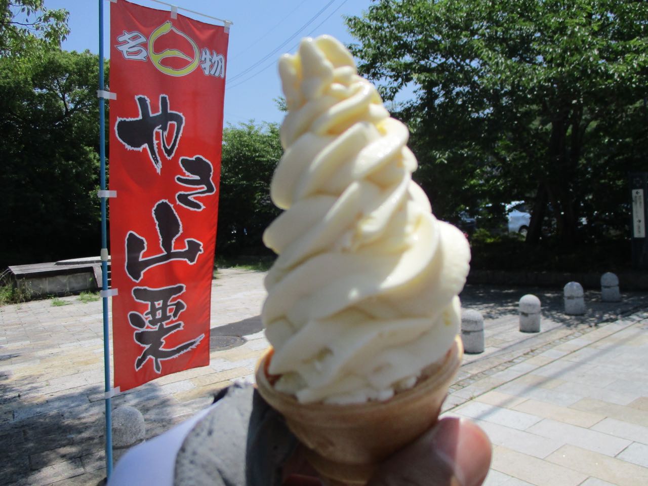 気温が上がってきたので、売店でソフトクリームを入手。宇治といえば抹茶だろう! と思ったのだが、栗がウリの売店のようなので、栗入りソフトクリームをチョイスした。つぶつぶの食感が幸せ。 ^^