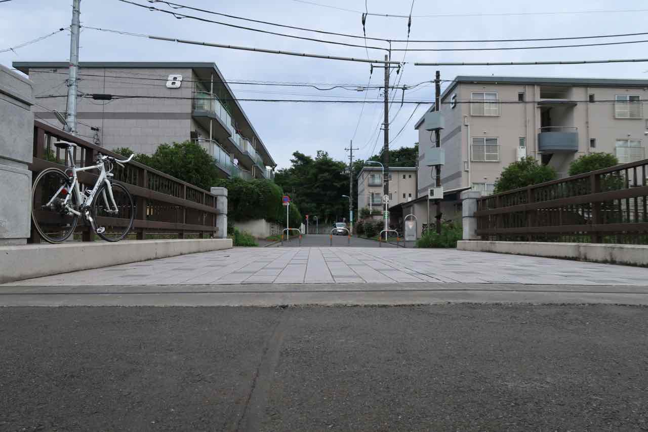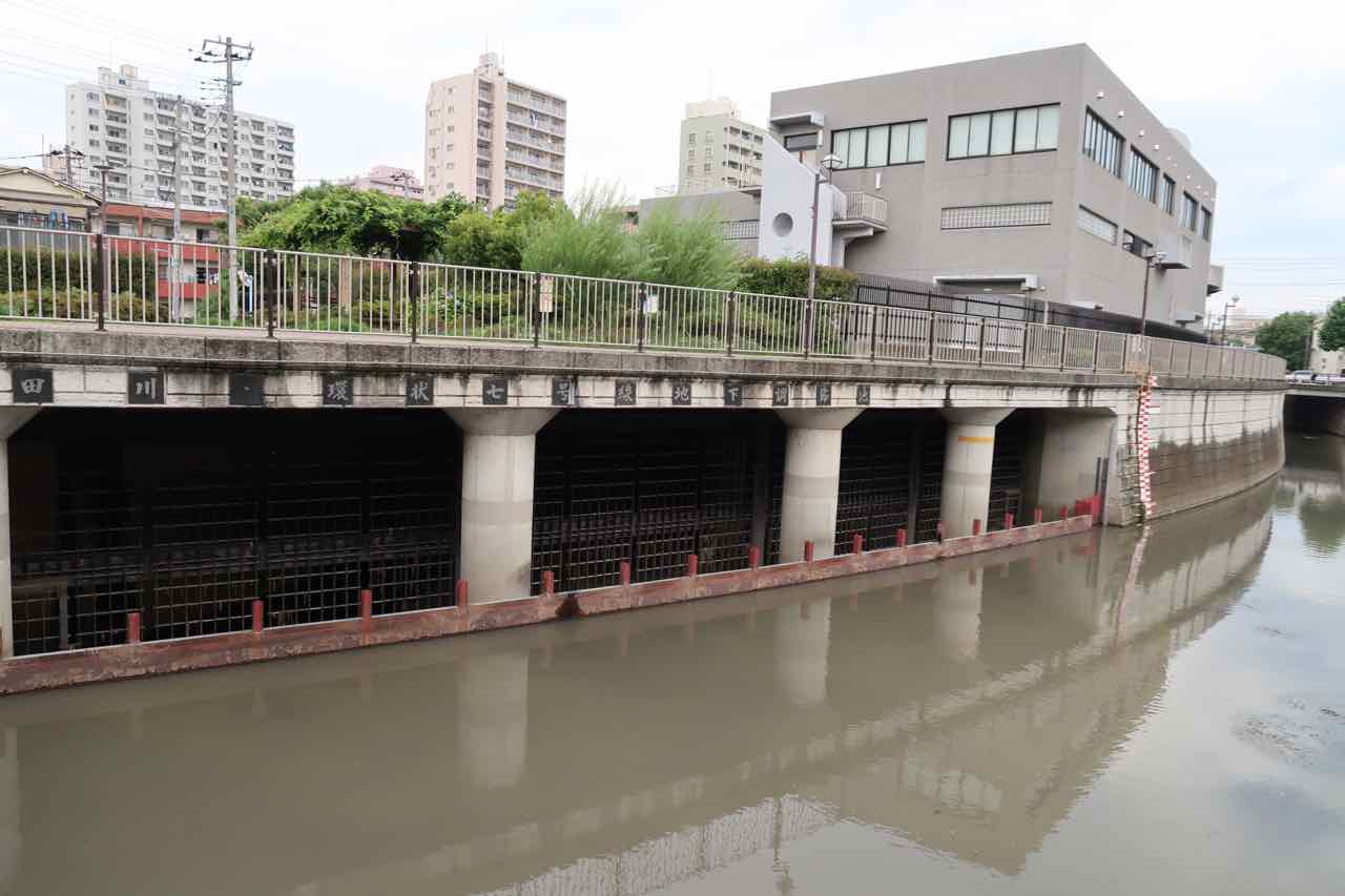 橋を渡って、対岸から戻ってきた 神田川・環状七号線地下貯水池 。川沿いの道の下の暗いところには、いったい何があるのだろう? とっても謎な施設だ。 ^^;