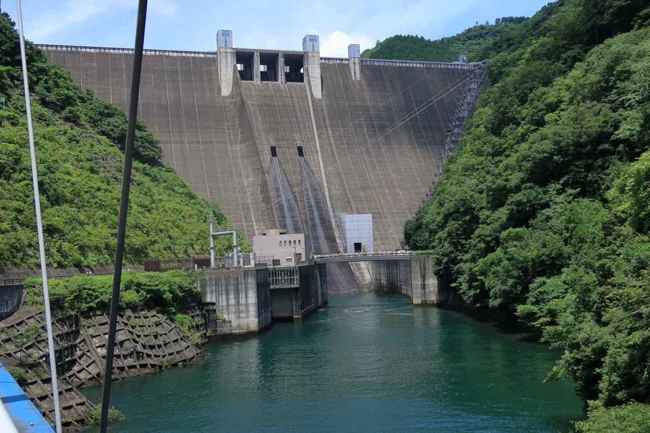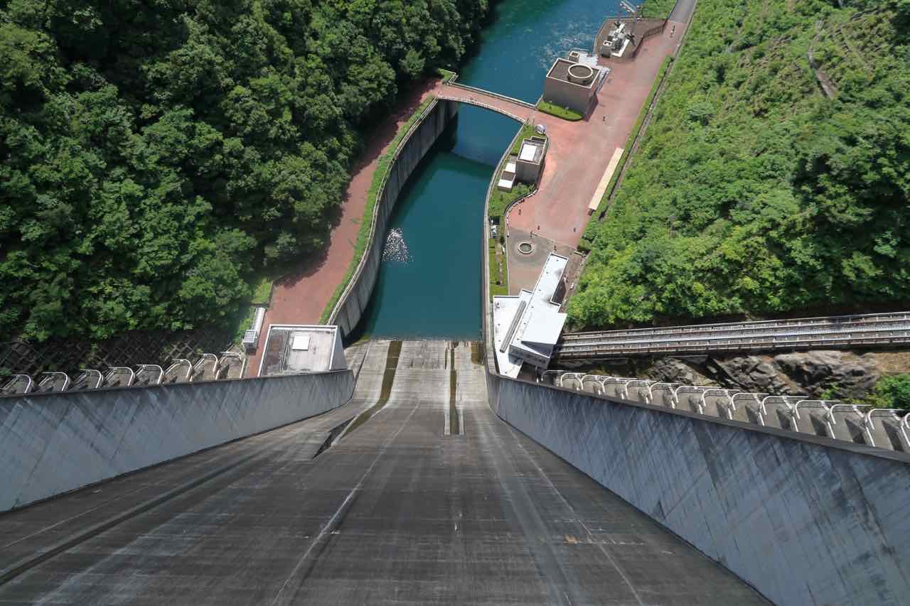 ダム上から見た下流側。放流口があるのだけど、わかるかな?