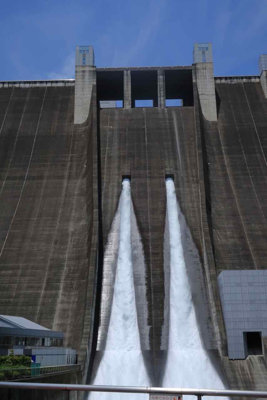 ダム側で迫力ある放流を見るのは楽しいけれど、ツウになると、遠景の撮影スポットを知っている。むふふ。…というわけで、放流が終わる前に移動する。
