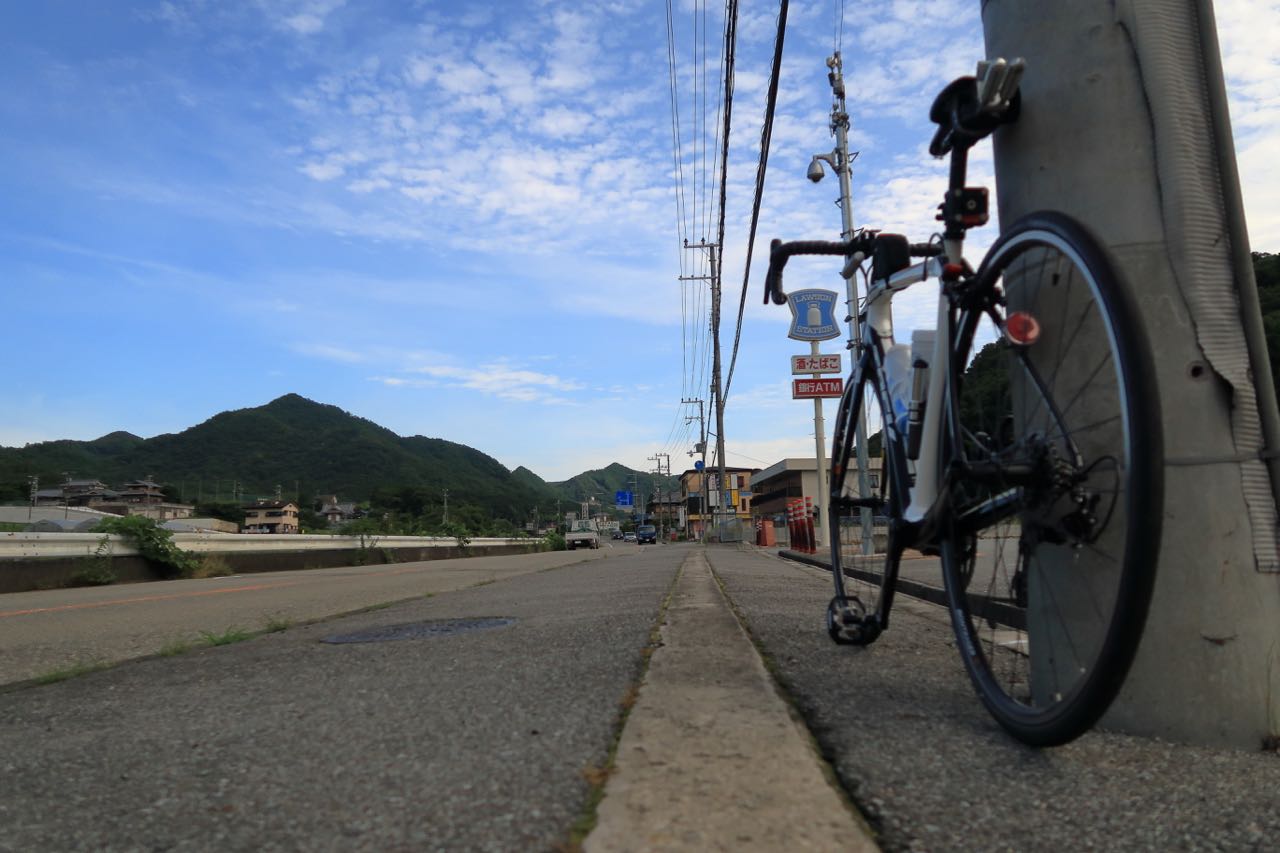 ローソンでサンドイッチとカフェオレを買って朝ごはん。まだ 7:00 a.m. 頃で、十分に涼しい。ここまで 15Km ほど走っだけなので、食べ終わったら、さっさと出発。まあ、全行程で 50Km だから、今回はゆっくり休憩する必要もないのだけど…。