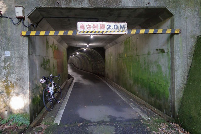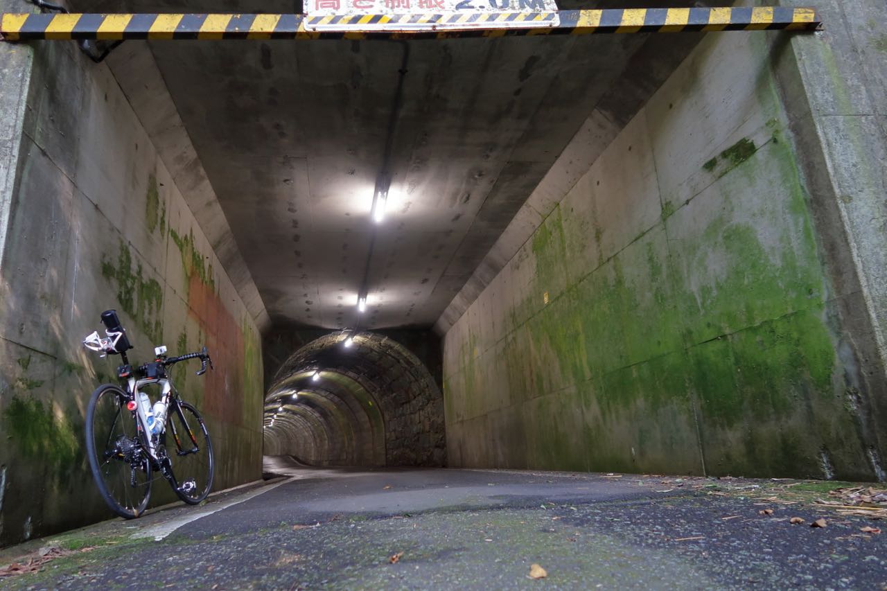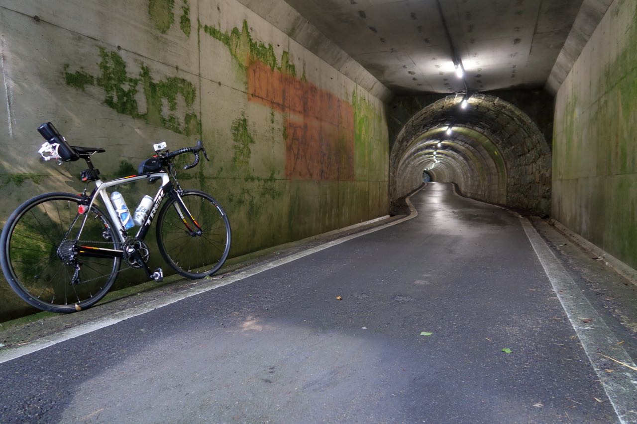 トンネルの距離は短くて、一応、出口が見えている。蛇足ながら、猛暑なのでツーボトル体制になってて、ツールケースをサドルの後ろに置いている。