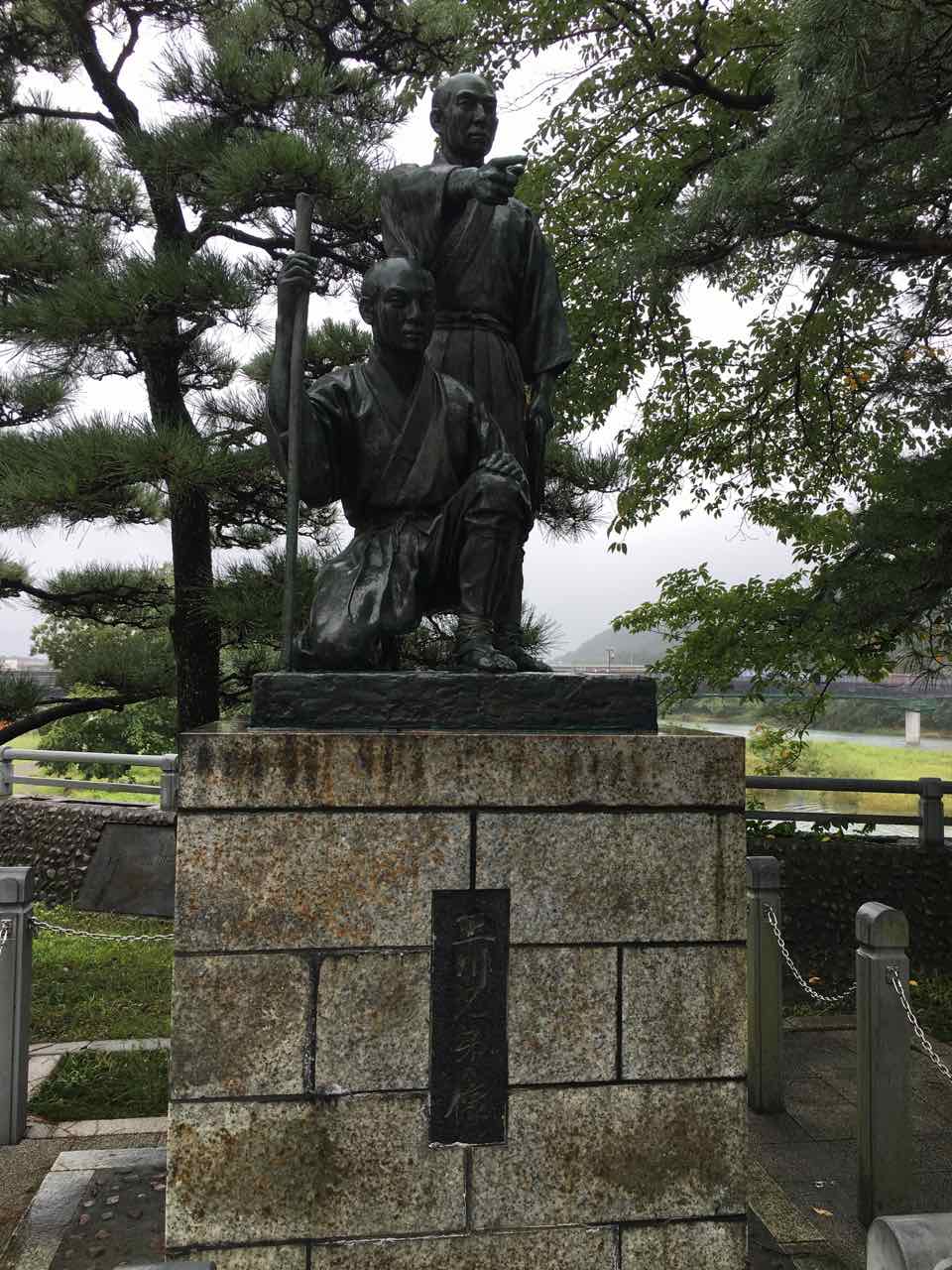 さて、行くか…と思ったら、サイクリングロードは羽村堰で切れていた。写真は 玉川兄弟の像 。