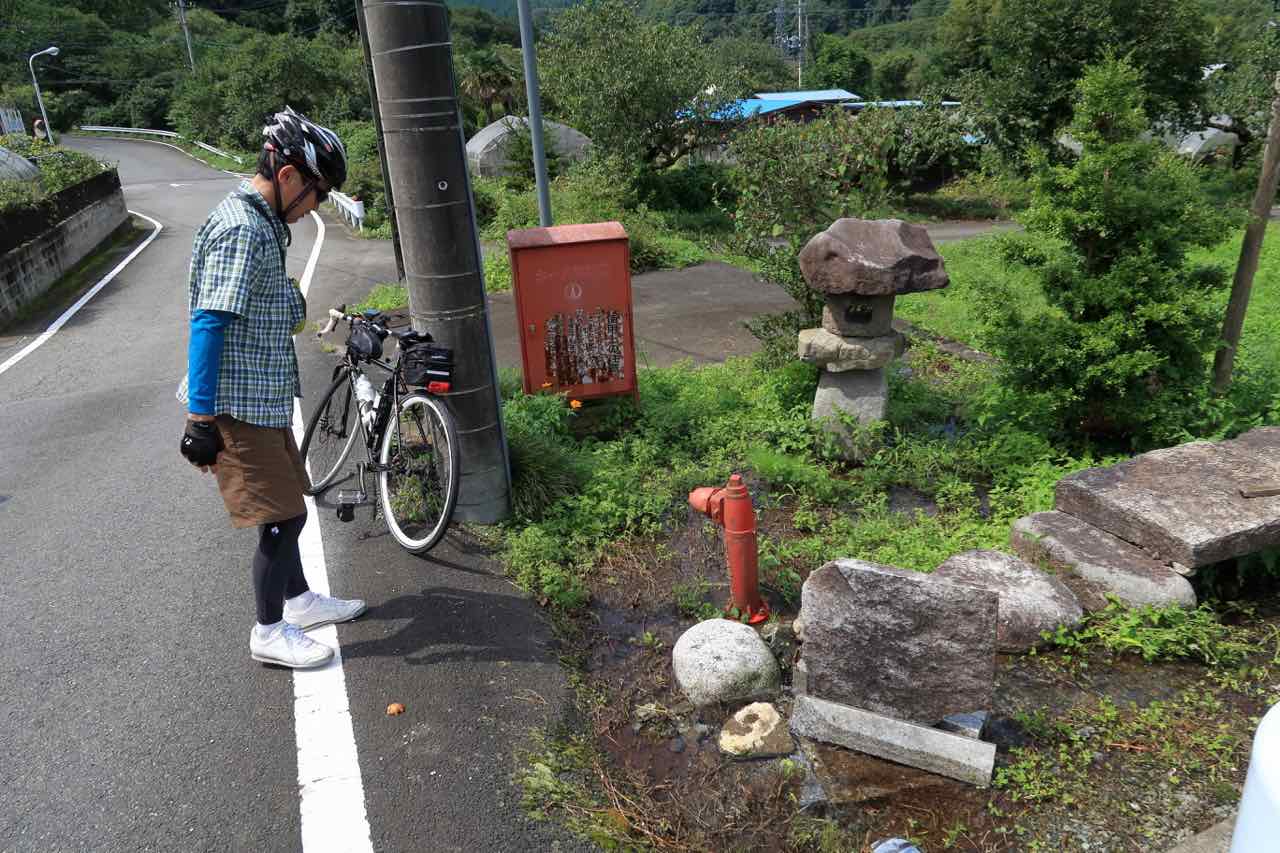 小川を見つけて、水と戯れるコガさん。完全にポタリングモードの服なのは、夜走だったからのようなのだけど、そもそもランドナータイプの人だから。