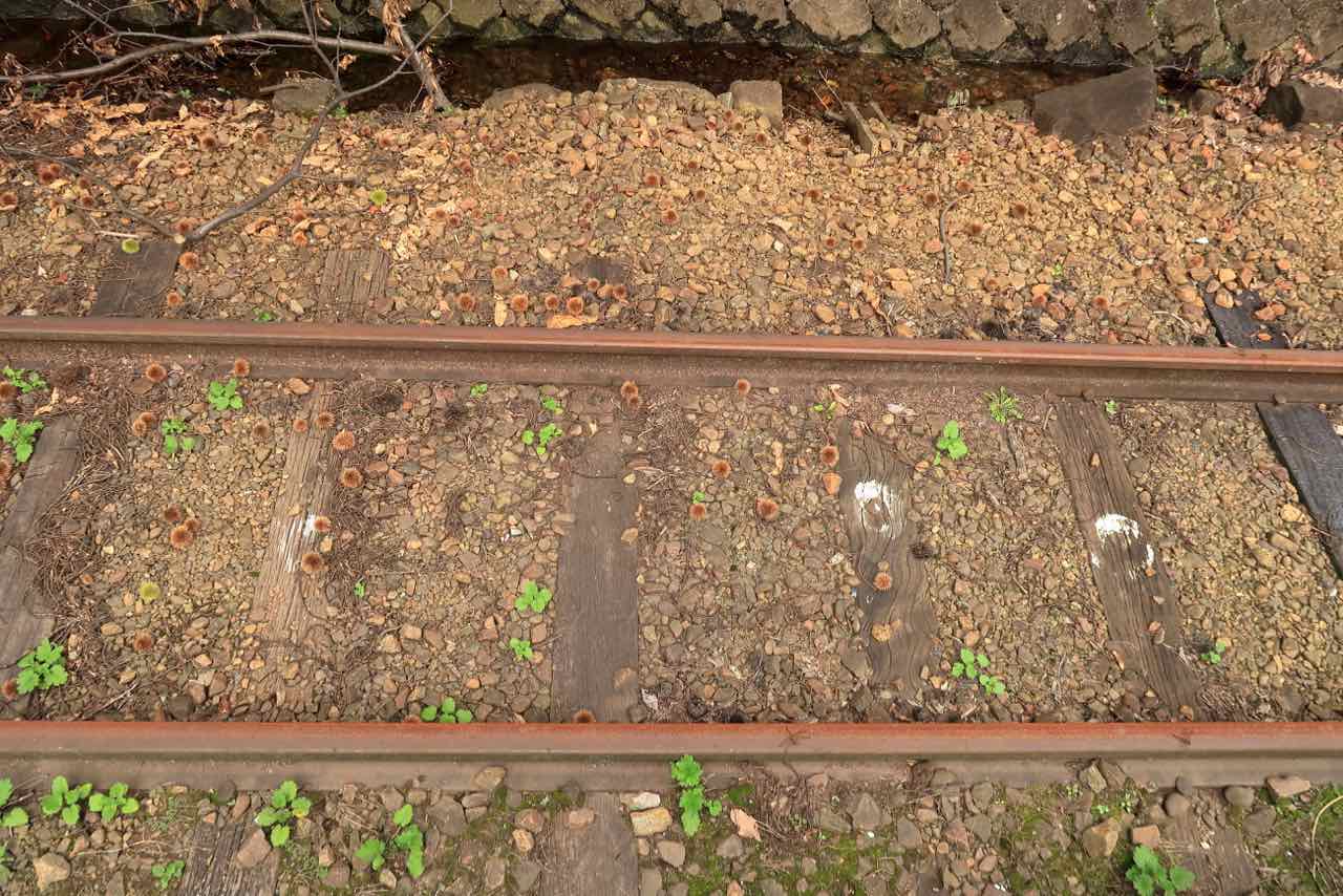 線路には栗が落ちてる。拾いたい気もするが、都会派の私には線路に降りるなんてできない…。 ^^;