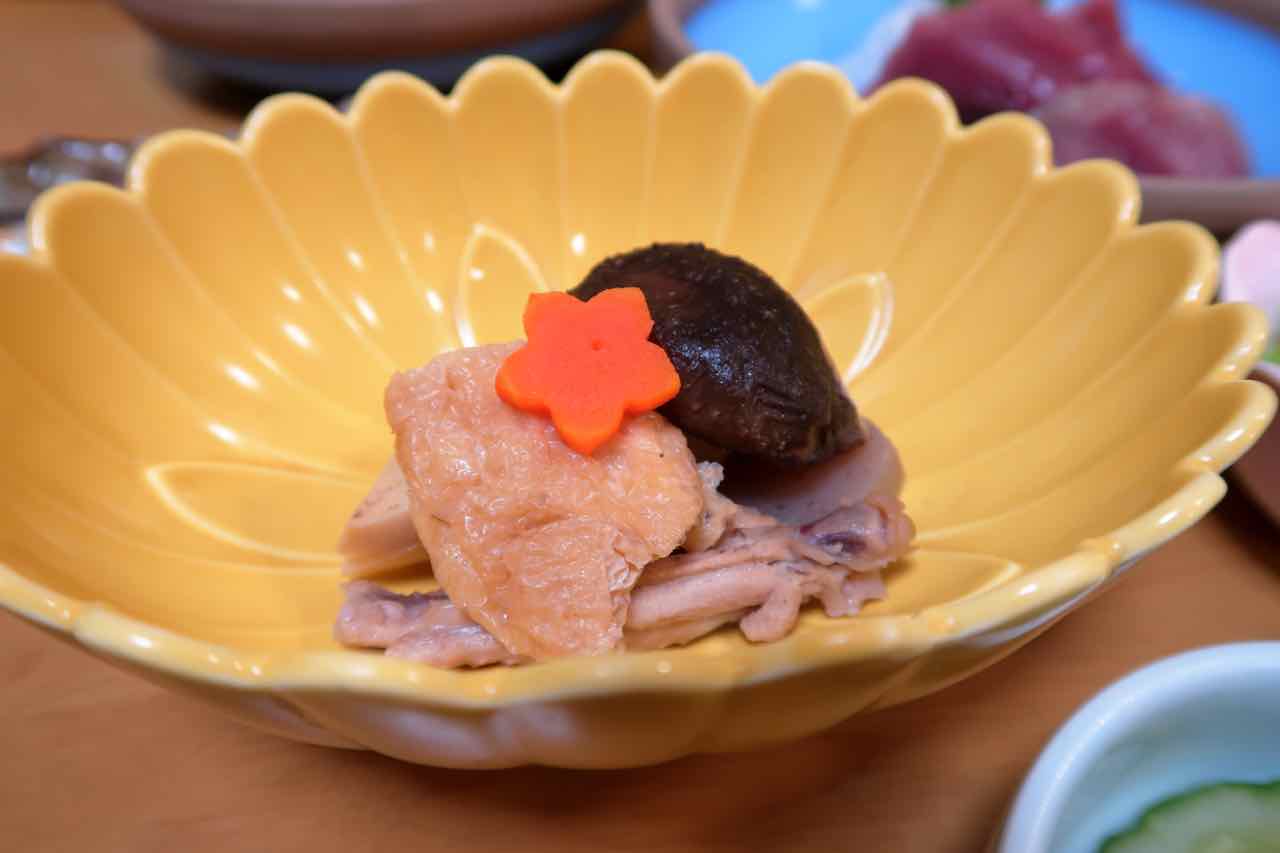 煮物!! 鶏肉、椎茸、薄揚げ、こんにゃく…なんかが入ってた。筑前煮的なもの。