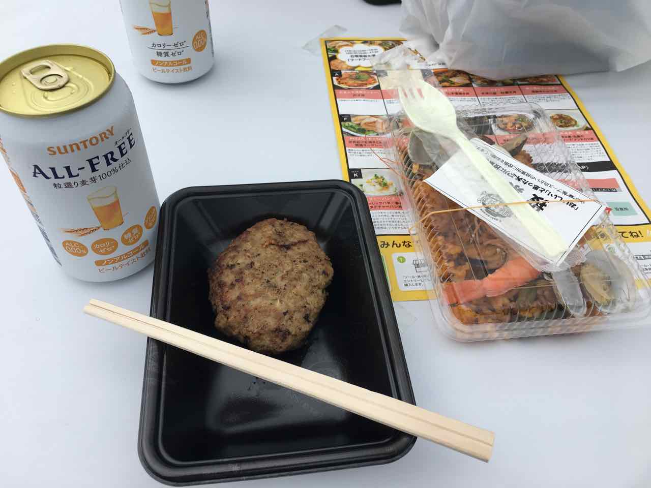 なんちゃらハンバーグとパエリアとオールフリー。まだ、自転車に乗るからノンアルで。写真には写ってないけど、牛タンも食べた。お祭りの屋台は楽しいなぁ〜。 ^^