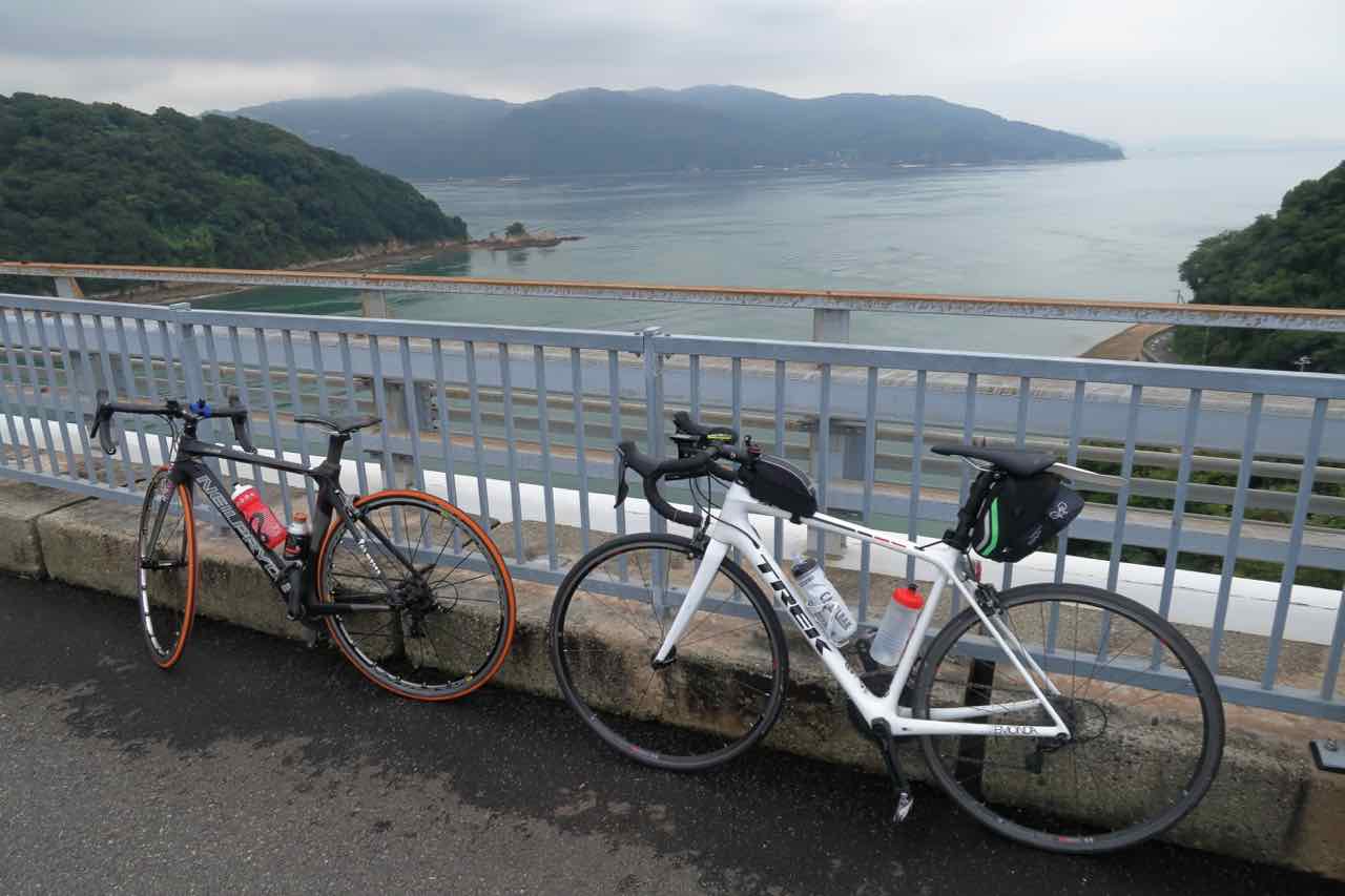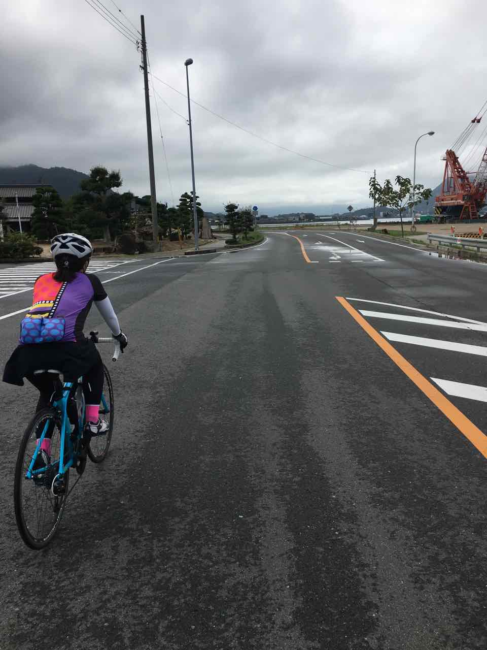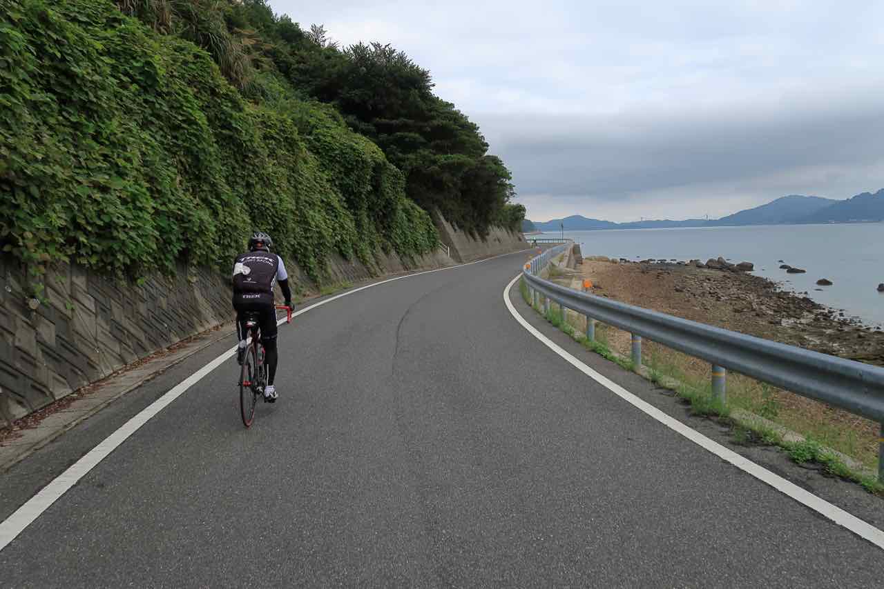 小雨が降ったりして、路面は濡れている。レインウェアを着たり、バックパックに防水カバーを装備したりして、因島を走り抜けてゆく。