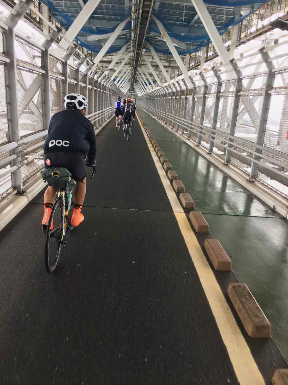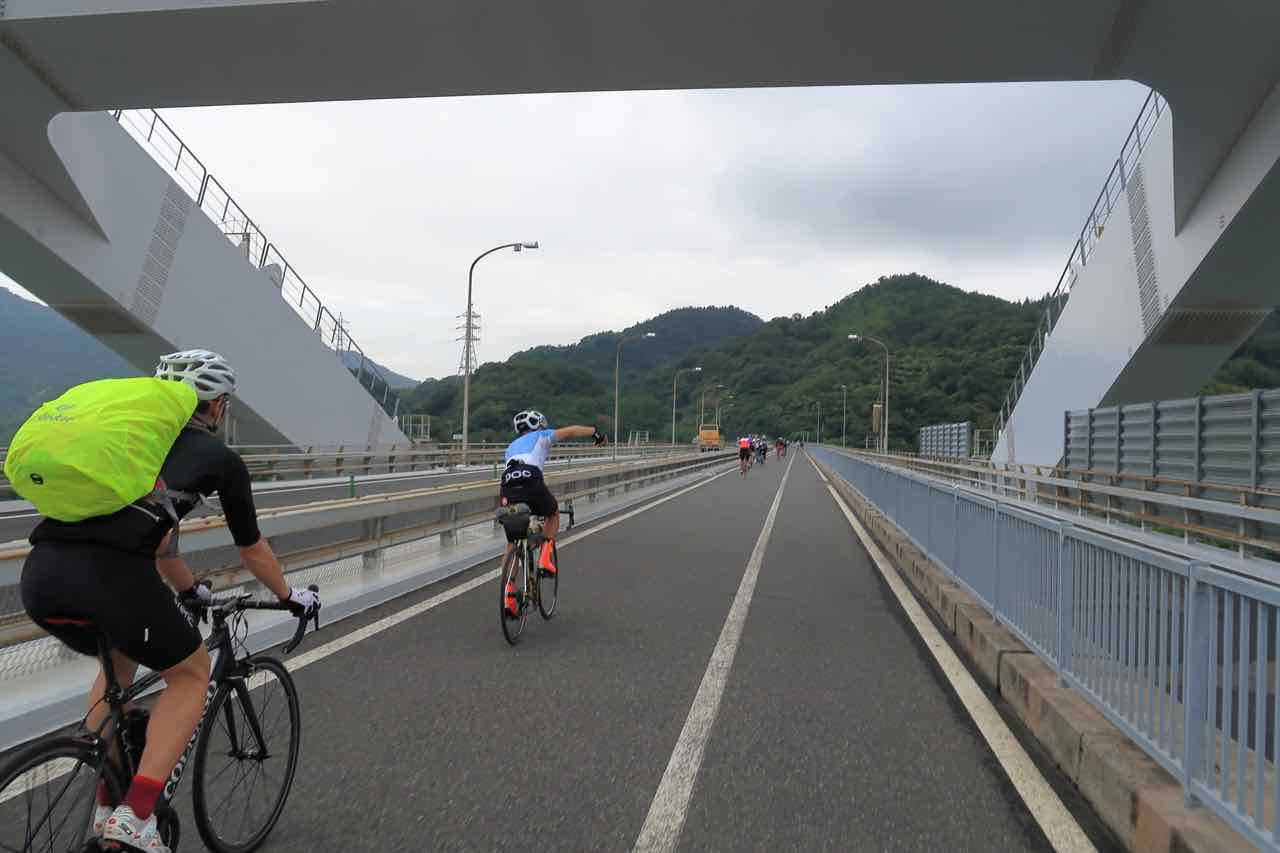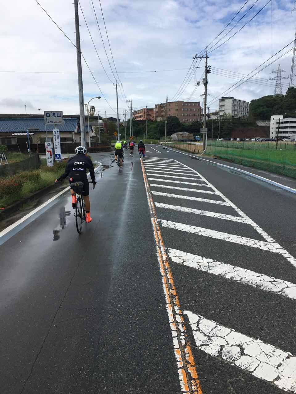 小雨が降ったりして、路面は濡れている。レインウェアを着たり、バックパックに防水カバーを装備したりして、因島を走り抜けてゆく。