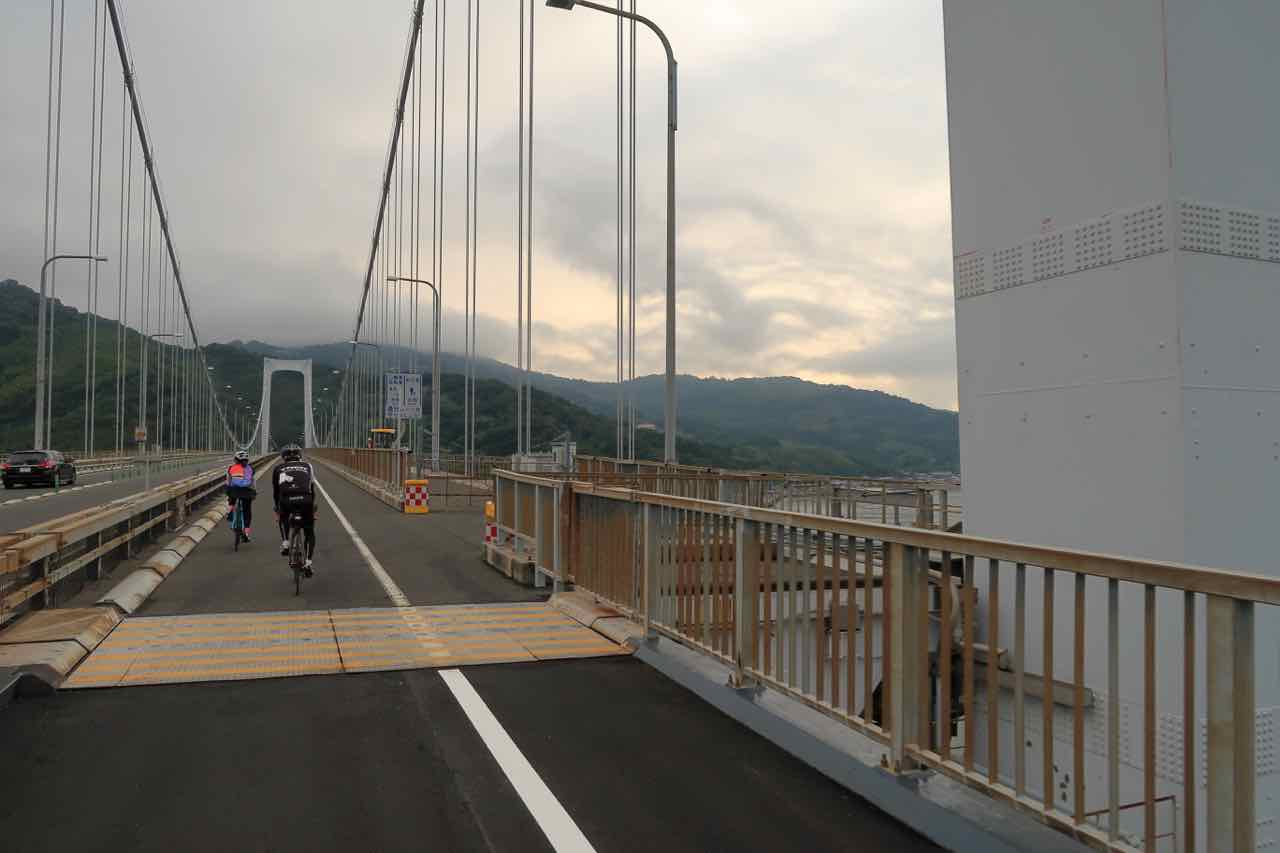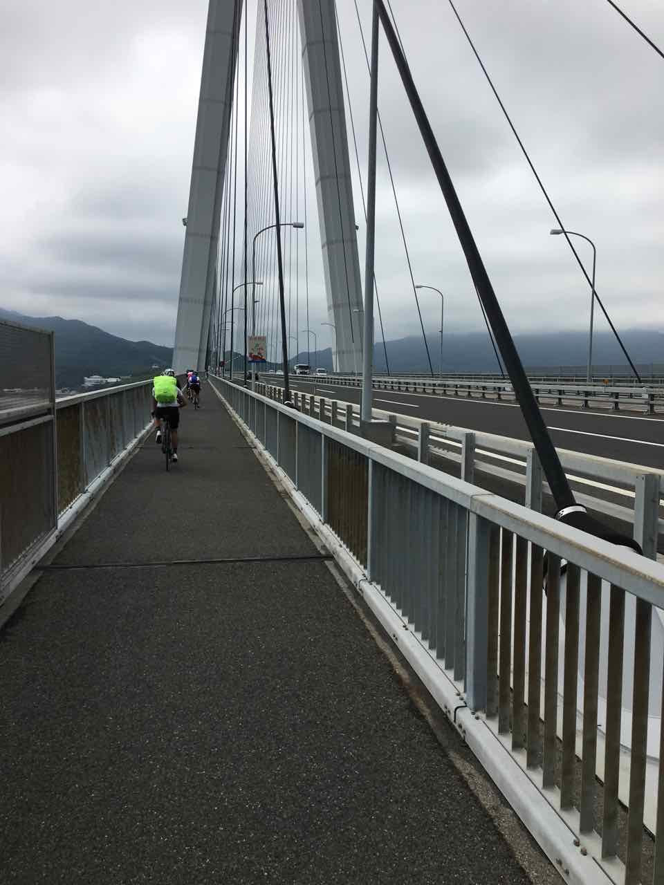 向島を通り抜け、まずは最初の因島大橋を渡って因島へ向かう。ここは、上が車道で下が自転車歩行者道になってるようだ。