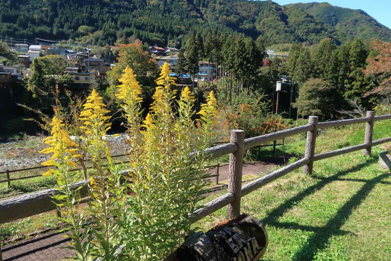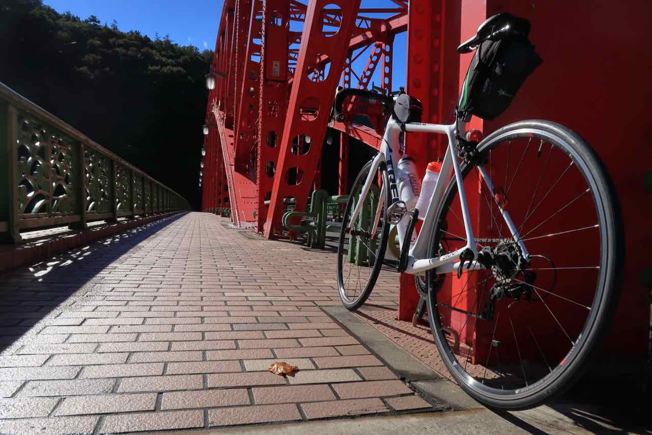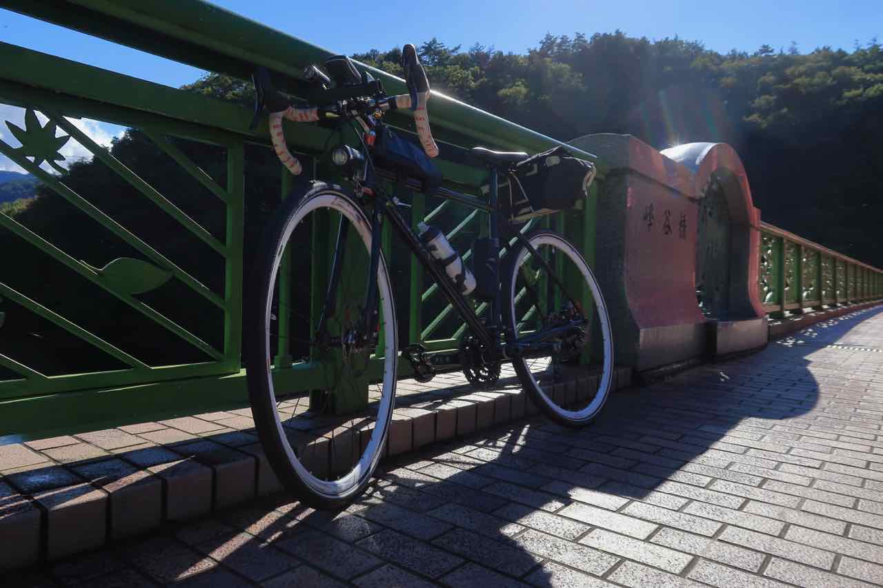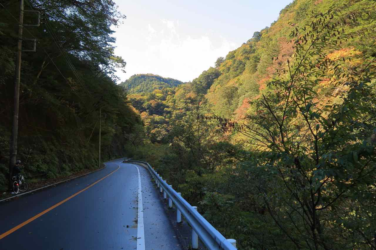 紅や黄に染まり始めた木々に囲まれ、川沿いに敷設された景観の良い道路。丹波渓谷と呼ばれているところらしい。ところどころ舗装の荒れたところもあるものの、交通量は少なくて、景観が良いので、サイクリングにはなかなかいい感じのコースだ。