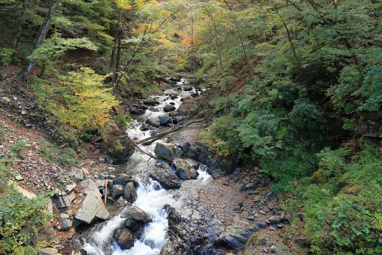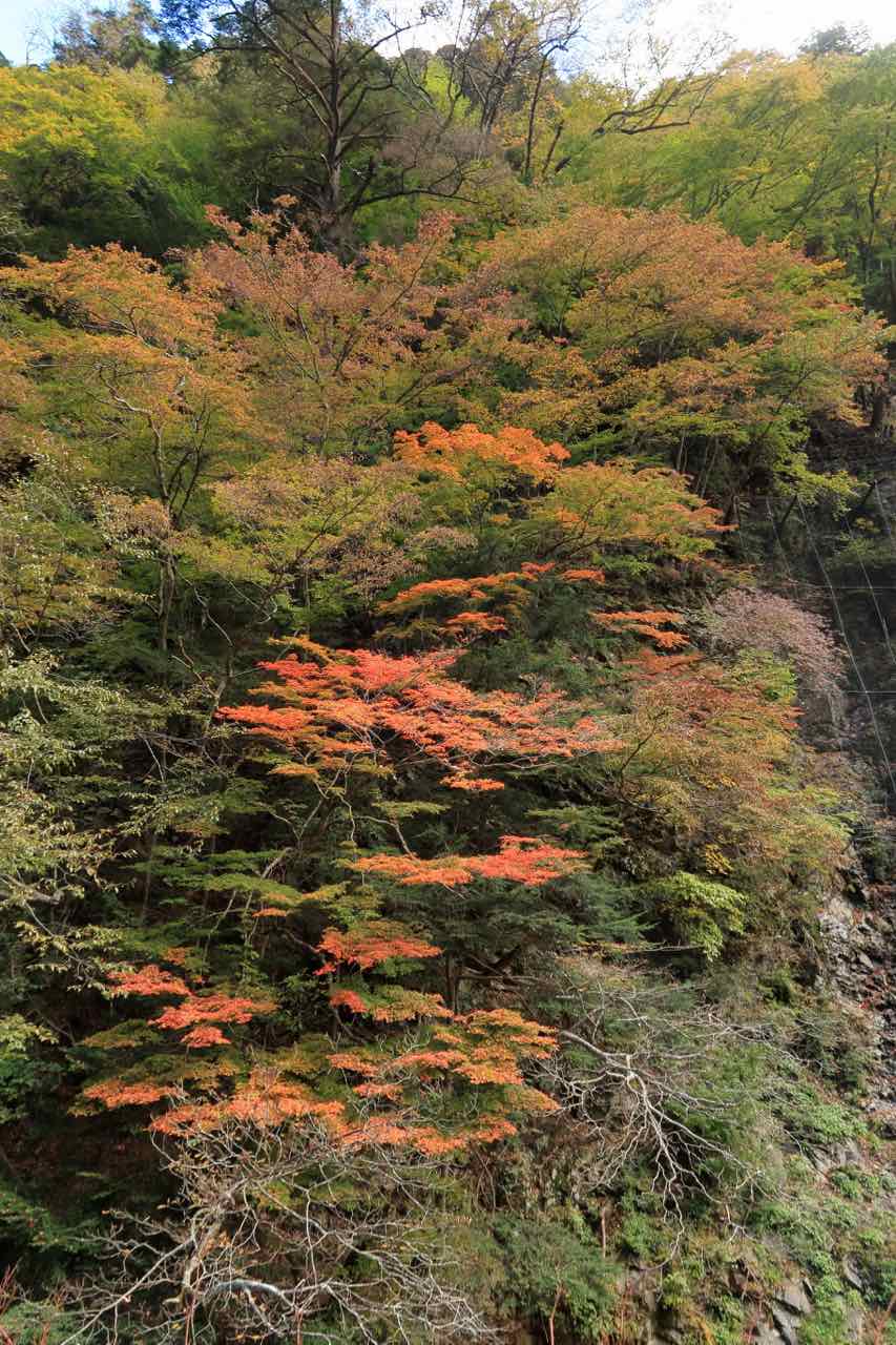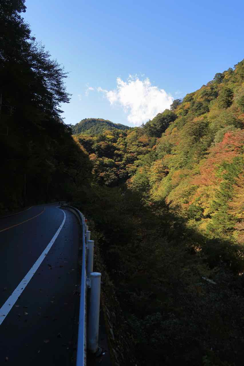 小休止。標高が高くなってきたので、だんだん紅葉っぽい景色になってきた。柳沢峠へ続く道は、激坂はないけど 5〜10% ぐらいの上り坂が続く。渓谷なので、距離は長いものの絶景が続く。しんどいけど、しんどくない。 ^^;