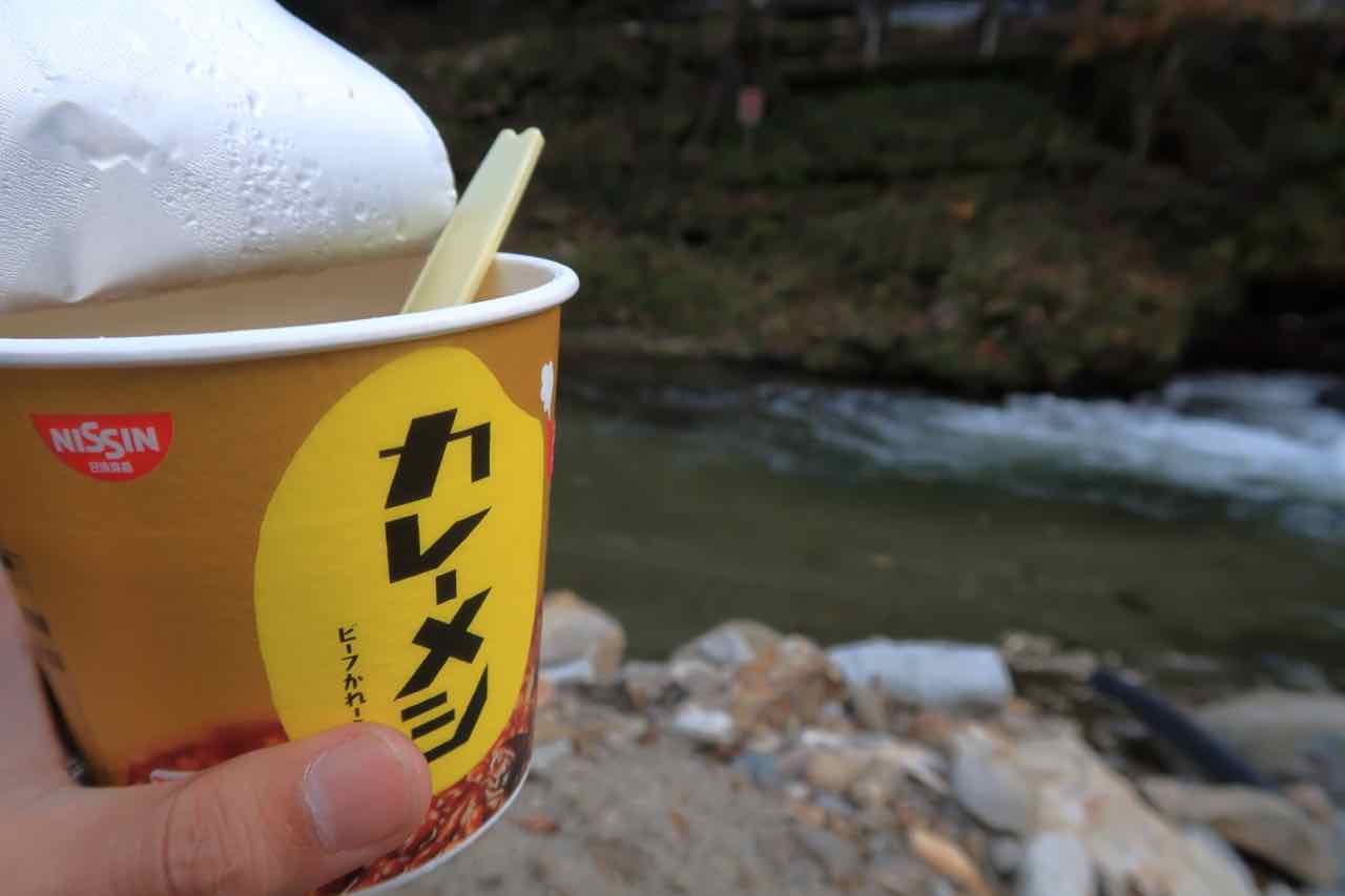 キャンプ場の看板を見つけた。ヤマメ釣り場になってる河原だ。柳沢峠の 5Km ほど手前だっただろうか? ちょうどいい時間帯だったのでランチタイムを取ることにした。