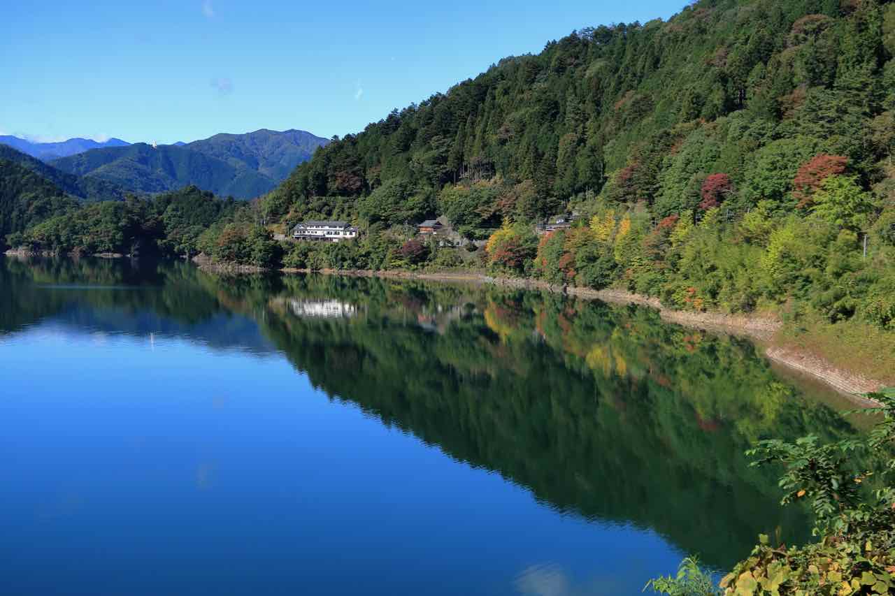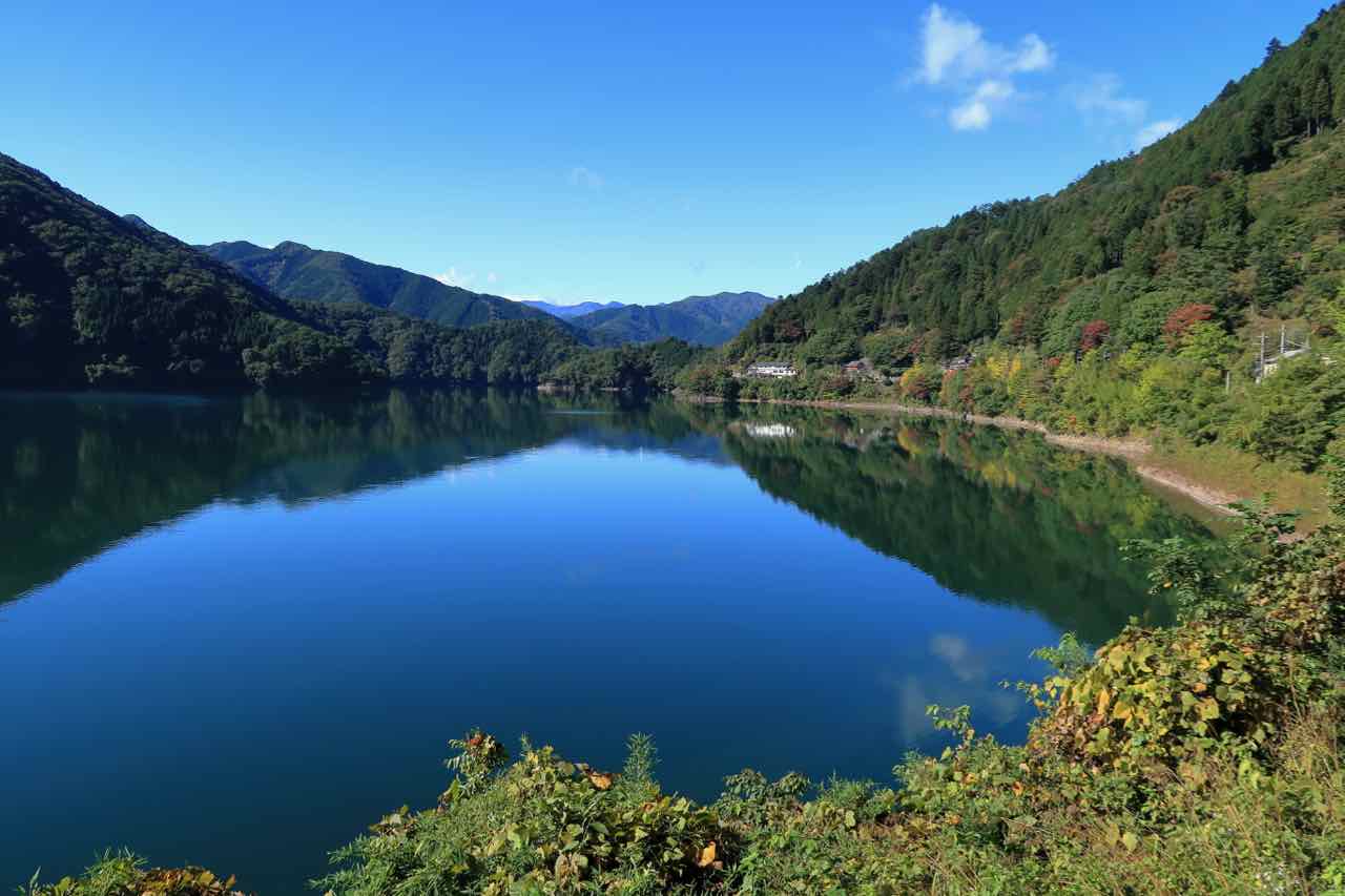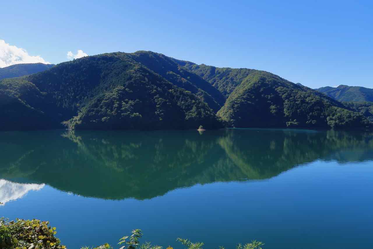 風がなく、静かな湖面の奥多摩湖。鏡のように周りの景色を映し出している様が絶景だ! 爽快すぎる!! ^^