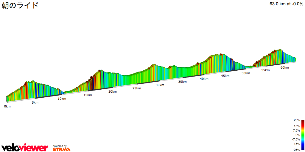 カーブを無視して、標高のみの表示にすると、ツール・ド・フランスなんかのコースプロフィール表示みたいだ。 ^^ なお、色は斜度を表している。