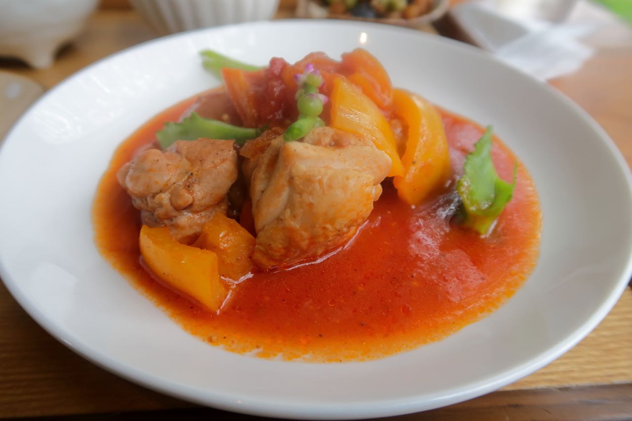 メインは とりもも肉とパプリカのトマト煮込み 。すっきりとしたトマトスープの味わいと、とっても柔らかい鶏肉。めっちゃうまい。 ^^