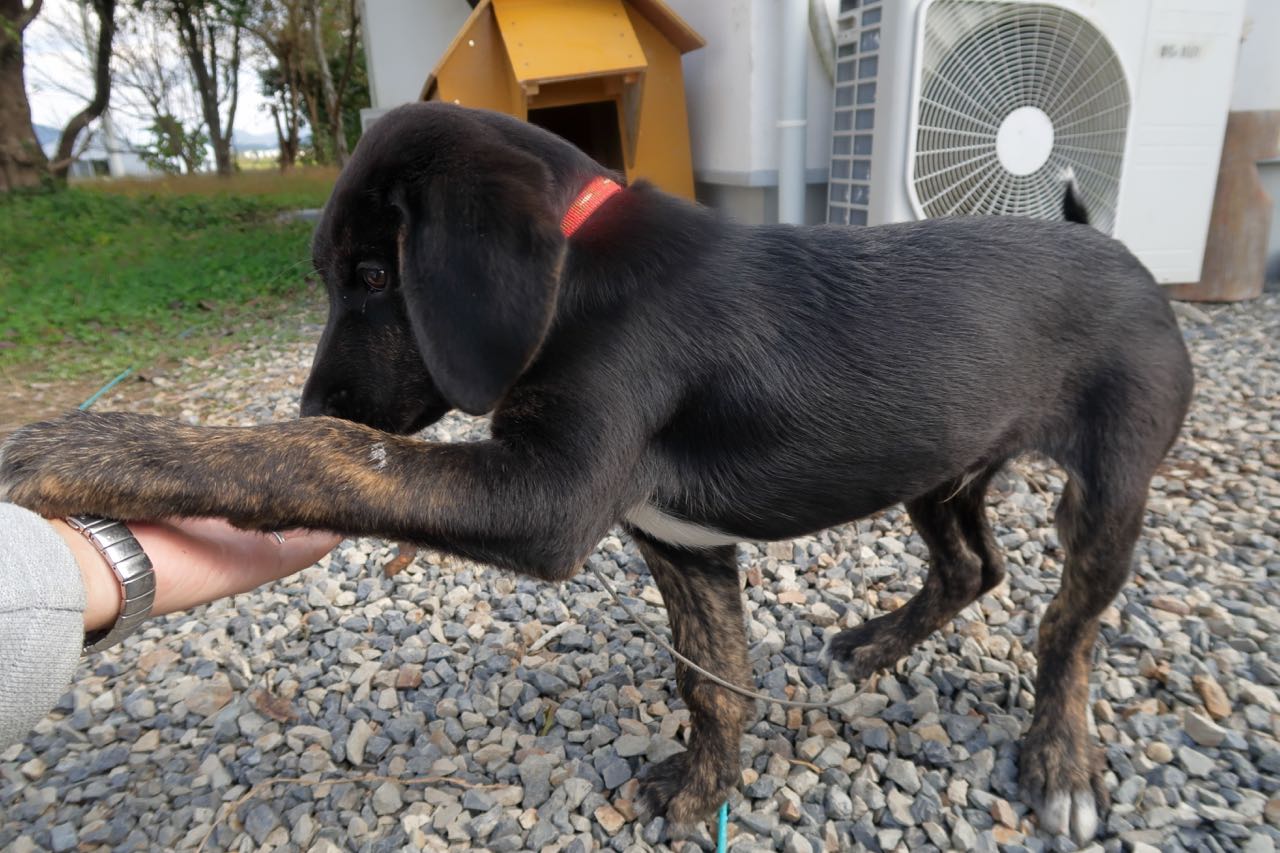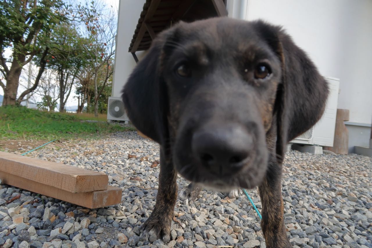 店の前には 新しく入ったスタッフ (黒い犬) がいた。名前はクロで、めっちゃ人懐っこい。^^ ランチで使用しているサツマイモを掘ったりしているらしく、マンパワーってゆーか、ワンパワーだ。^^; お手をしているような写真になったけど、じゃれているだけなので、ただの偶然。 ^^;