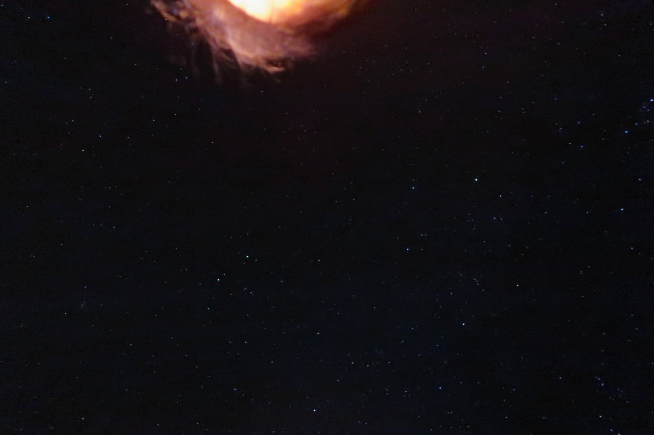 夜明けまでたっぷり時間はあるので、カメラをイジって星空の撮影に勤しむも、三脚を持ってなかった (& 夜景は撮り慣れてない) ので、このぐらいが限界だった。上の方に写っている明るい部分は、たぶん焚き火の炎だ。 ^^;
