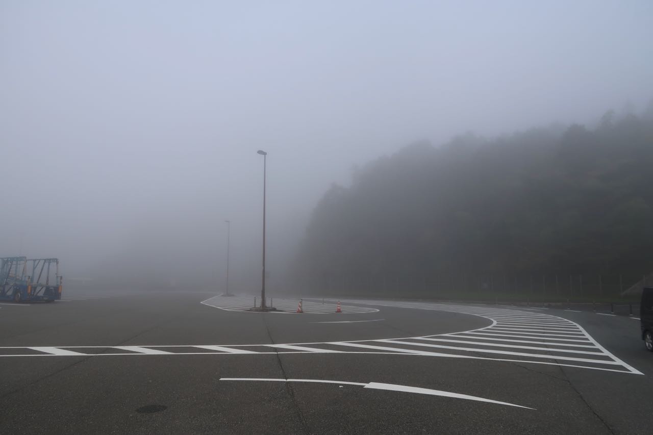 帰りは、雲海の中を通るので、とーぜんこーなる。 ^^; 霧が濃くなるところでは、見通し距離 30m ほどしかなかったかもしれない。そんな中、事故ることなく無事に連れて帰っていただいた。感謝。
