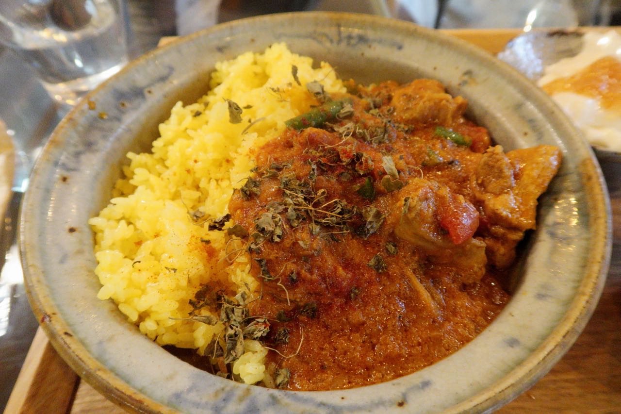 たぶん、小麦粉も水も使わず、トマトで作ったカレーだと思われる。サラサラとしたスパイシーなカレーで、とってもヘルシーな感じの美味しいカレーだった。ライスはサフランライスかな?