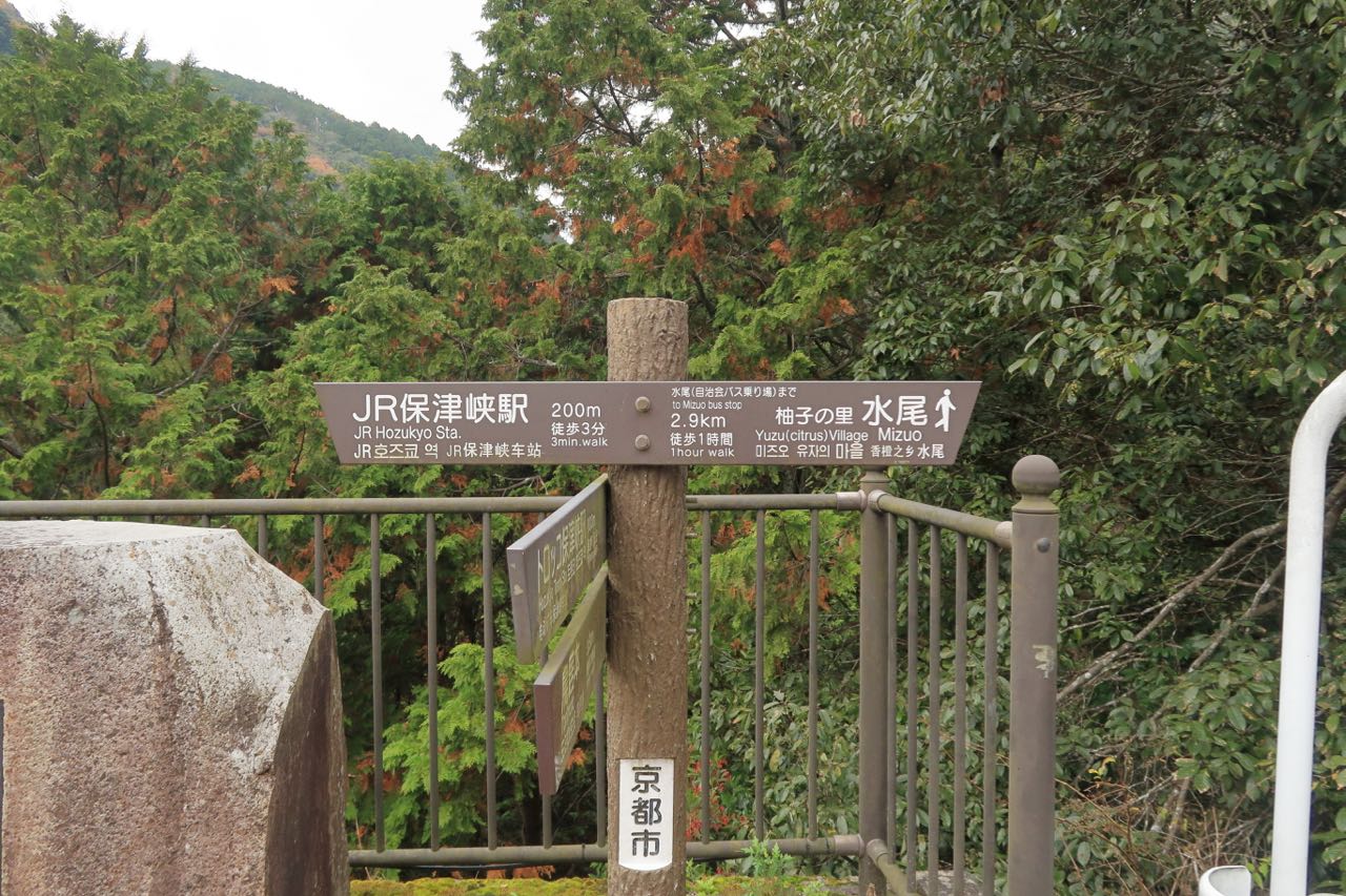 引き続き、狭い山道を通って、保津峡を目指した。県道 50 号線かな? 時折、すれ違う車に道を譲るために退避スペースに避けたりしながら。途中、柚子の里あたりでは少し観光客がいたけど、人より野生動物に遭遇しそうな道が続く。
