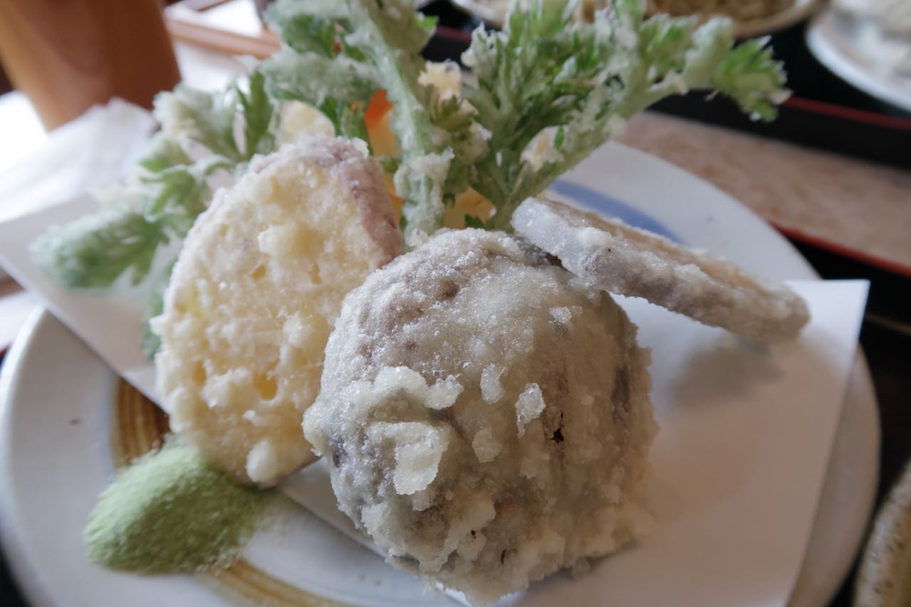 頼んだのは天ざる。天ぷらは、季節によって内容が変わるそうで、今回は秋の盛り合わせ。三ツ葉、さつまいも、椎茸、蓮根、玉ねぎ、人参だったかな? それを抹茶塩で食べる。肉厚の椎茸が、特にお気に入りだった。 ^^
