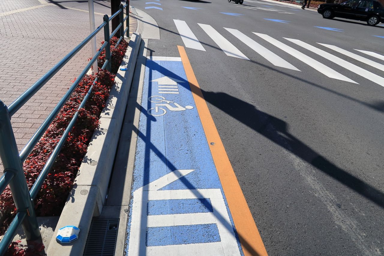 武蔵小杉あたりだっただろうか? 自転車用のブルーゾーンが確保されていて走りやすかった。距離はとっても短かったけど…。 ^^;