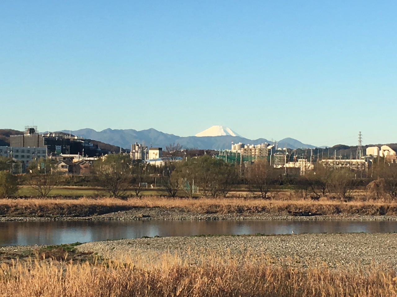 雲ひとつない快晴で、多摩川サイクリングロードから冠雪した富士山が綺麗に見えた。