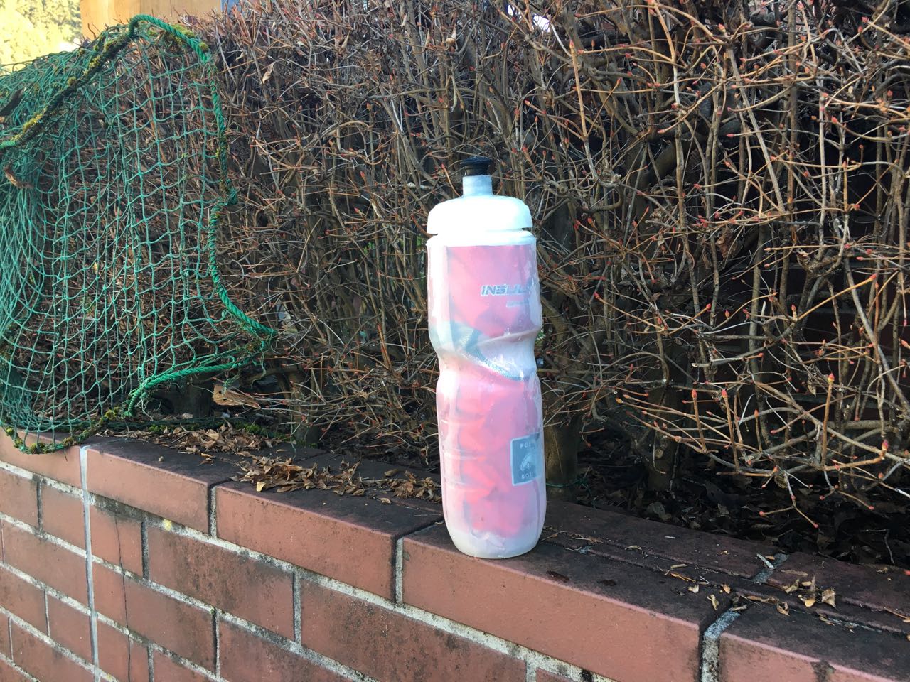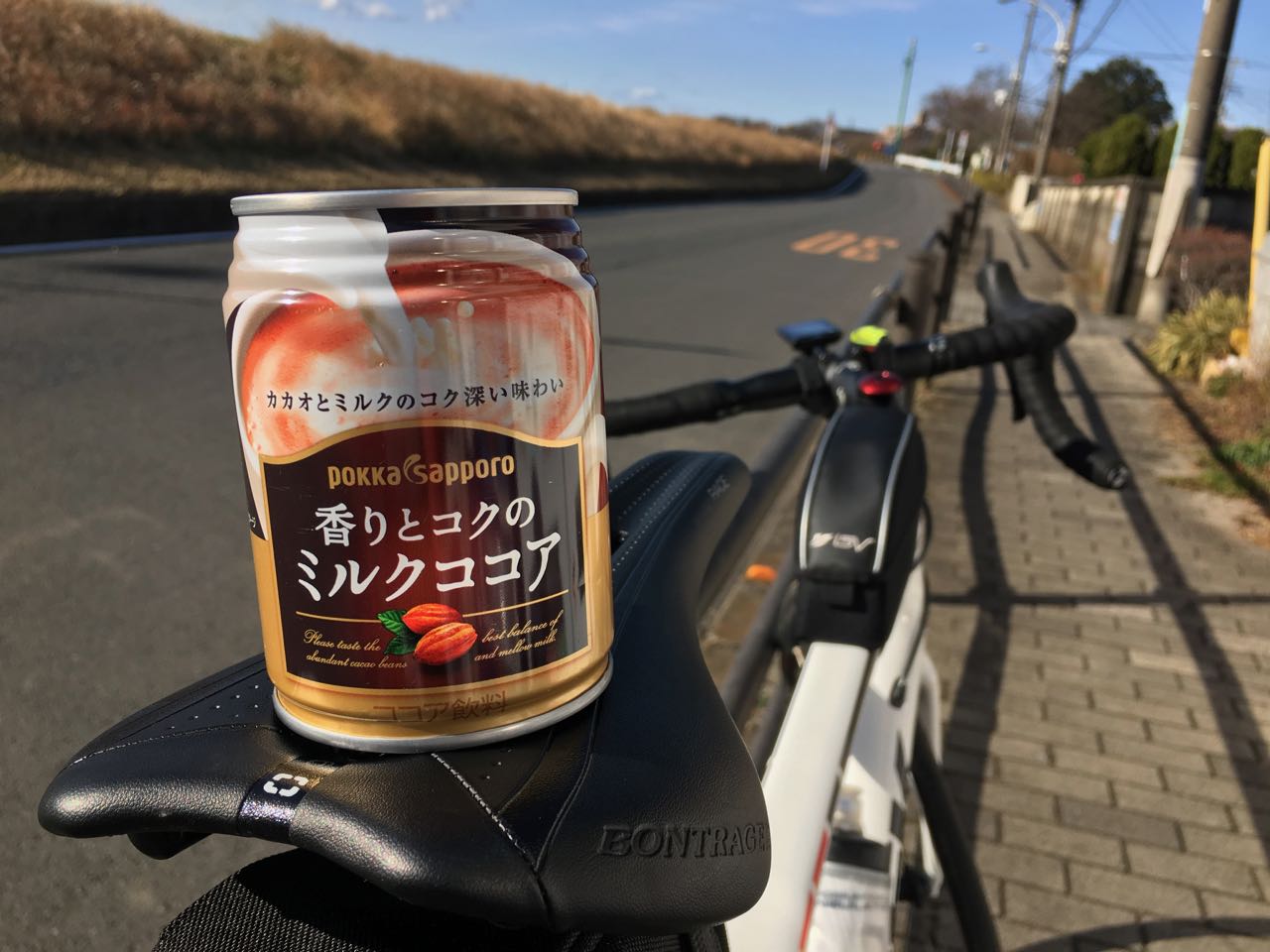 忘れ物のボトルが置いてあった。半分ほど残っていた中身はすっかり凍っていた。 ^^; 持って帰って、持ち主を探すのも一興かと思ったものの、 Emonda のシートチューブにはボトルケージが付いていない (fabric のヤツしか使えないのだ) ので、そのまま置いてきた。 ^^;