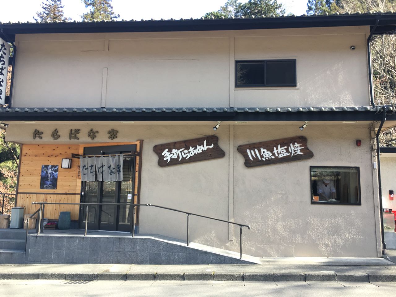手打らあめん 川魚塩焼 となにやら美味しそうなお店 たちばな屋 があった。時刻は 11:30 a.m. で、ランチで賑わう前だろう。以前から気になっていたので、これはいい機会だ。