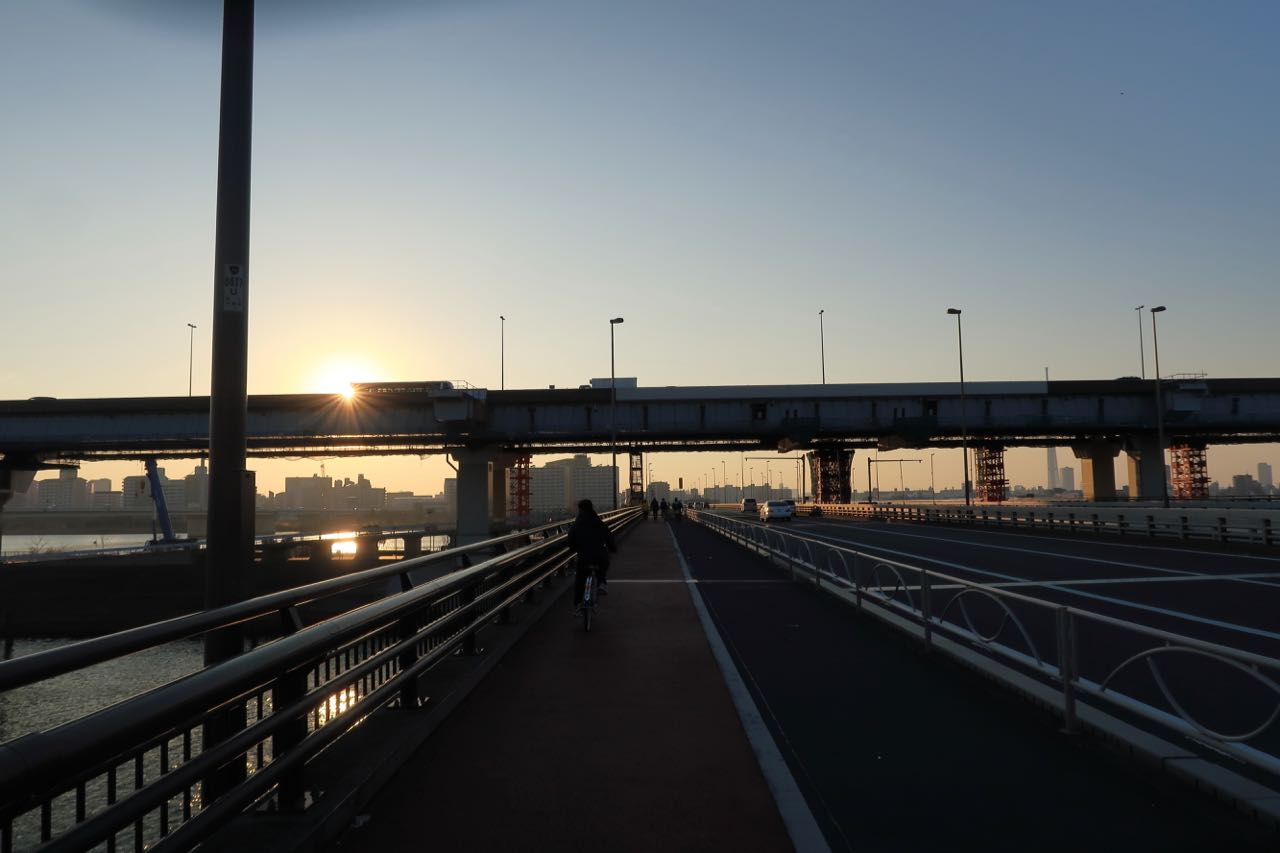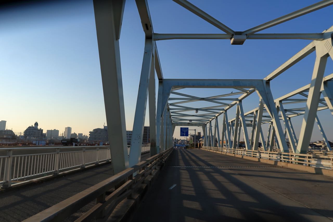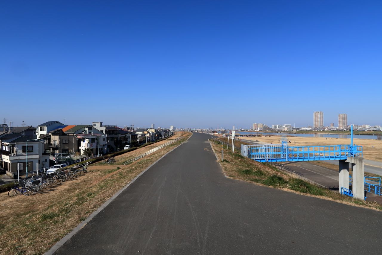荒川を超える橋は軽車両通行止めになってて通れない。しょーがないので、歩道橋を進んでゆく。