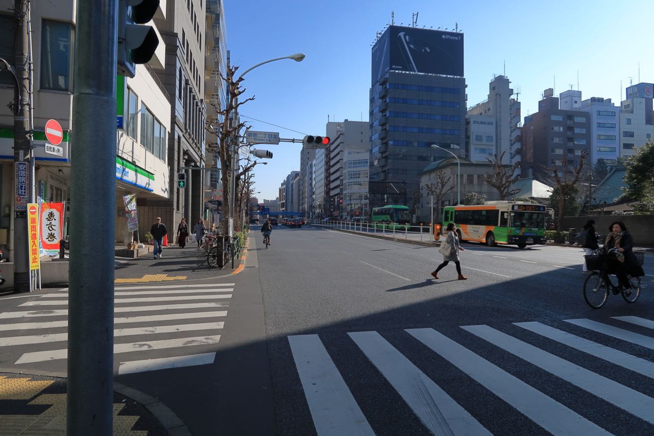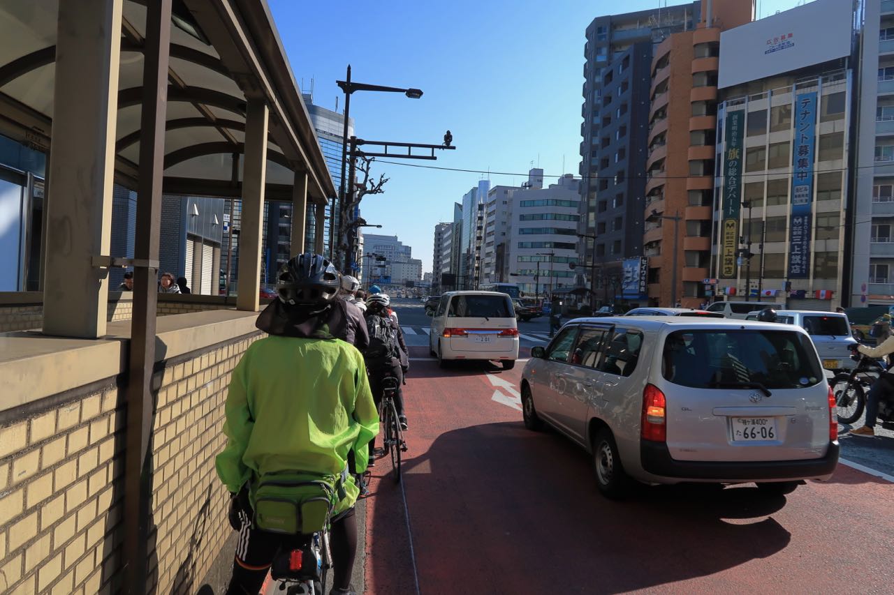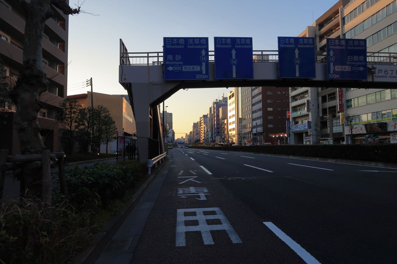 …と思ったら、さ、さ、寒い…。 (><) 出発した 9:30a.m. 頃の気温はまだ 5 ℃。ペダルを漕ぎ出すと風がしみるし、耳が痛い。信号で止まるとガクガク震える。 ^^; 10 分ほどで震えない程度には温まったけど、まだ寒い。特に耳がつらい。快晴で気持ちいい太陽は出ているのだけど、大都会東京のビル街は日陰が続く。一時間ほどで気温は 8 ℃ ほどになり、暑すぎず寒すぎず、ちょうどいい感じになった。