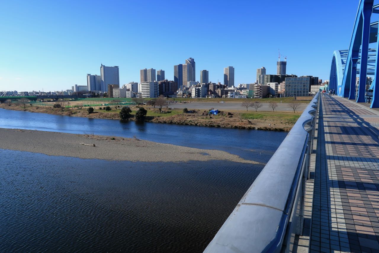 丸子橋にて。このあとは綱島街道へ分岐して、横浜、みなとみらい、関内を抜けてゆく。