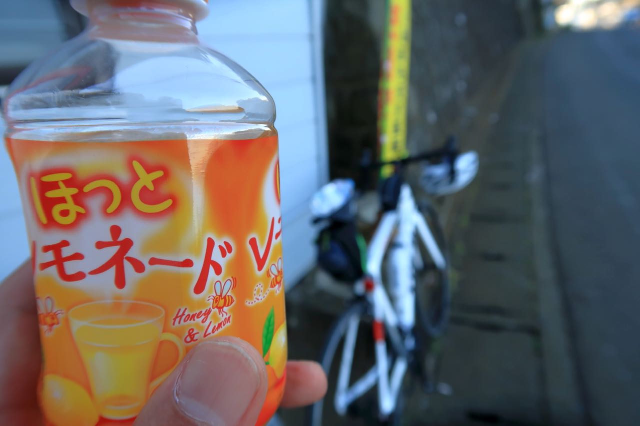 100Km を過ぎて、残り 60Km ほどだったかな? なかなかしんどいので、自販機休憩。美人女将が入れてくれた水もかなり減ったので、ついでに水も。この時期にしては珍しく喉が乾く。