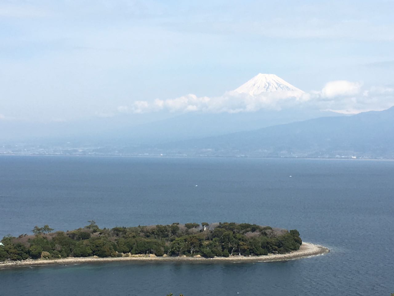 次の目的地の堂ヶ島へ向けて、少し上ったところで、神池と富士山を同時にレンズに収められる場所を発見! 先端部分が神池なんだけど、池が見えない…。 ^^;
