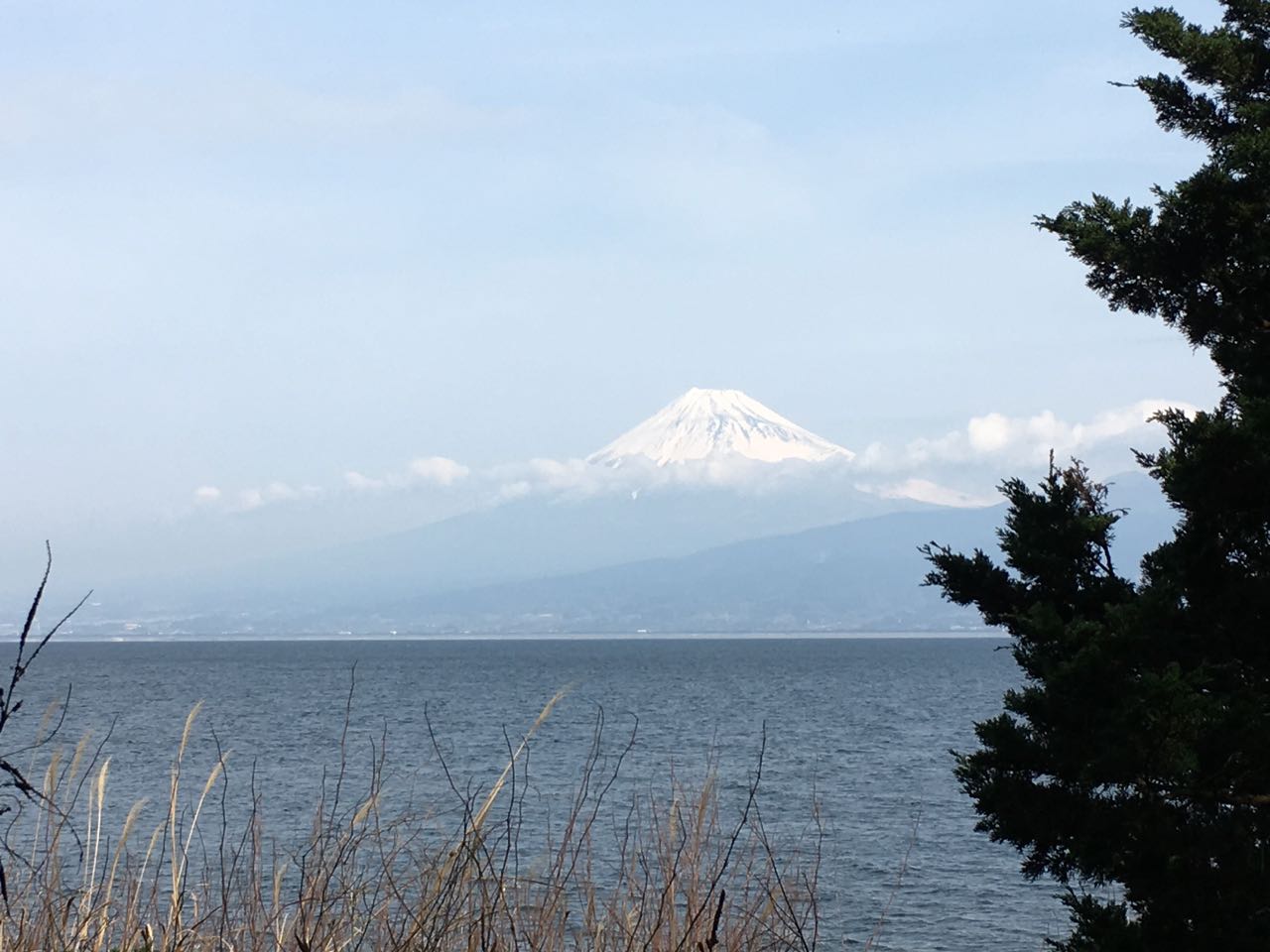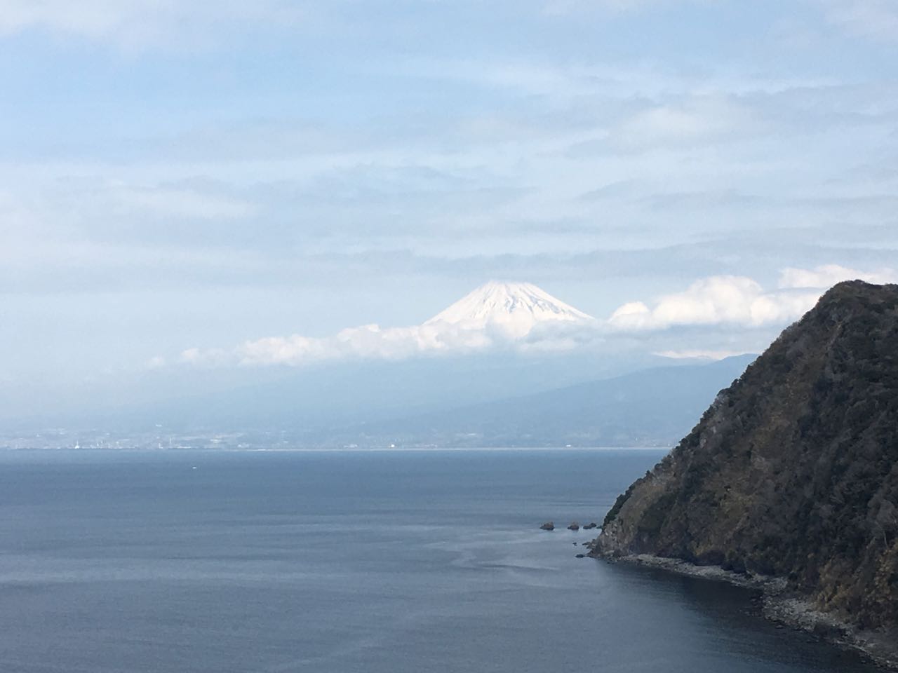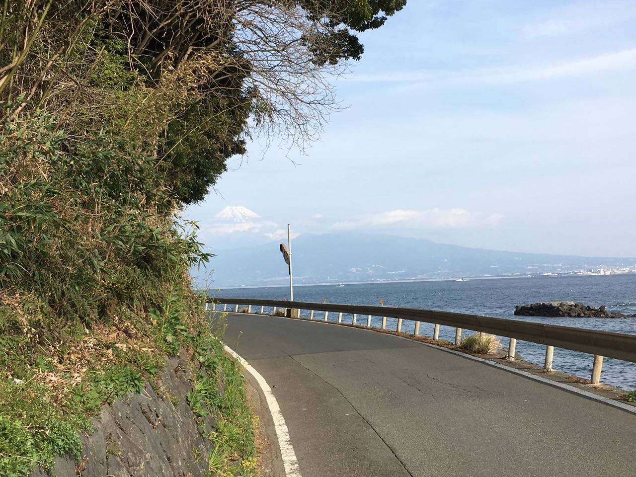 海沿いに出るまで GARMIN のナビで、裏道っぽい通りを抜けてゆく。川を渡る橋のところで富士山が見えた。富士山が見えるかどうかでテンションが全然違うから、いい感じで晴れて良かった。 ^^ 風が強いという噂の西伊豆だが、このあたりはほぼ無風だったし、全般を通しても、そんなに風に悩まされたってことはなかった。ラッキーだったようだ。 ^^