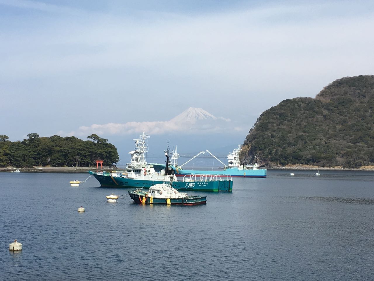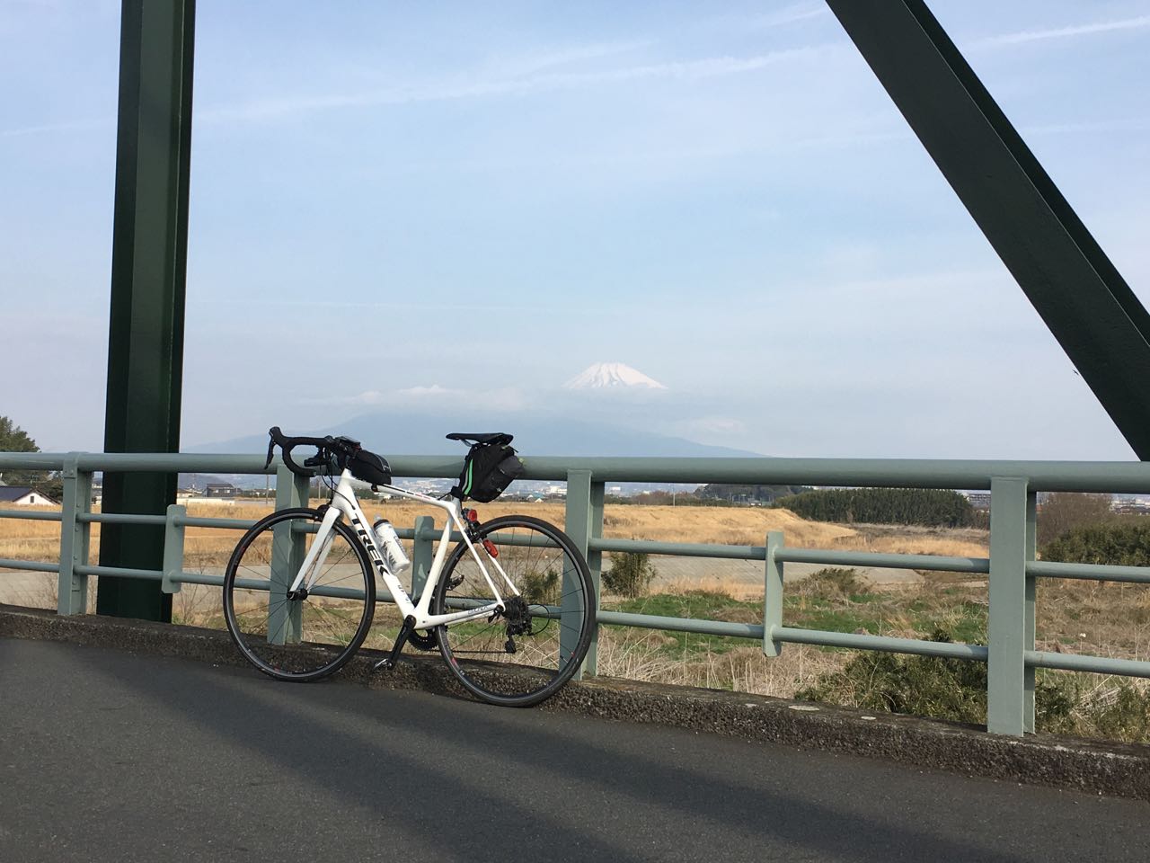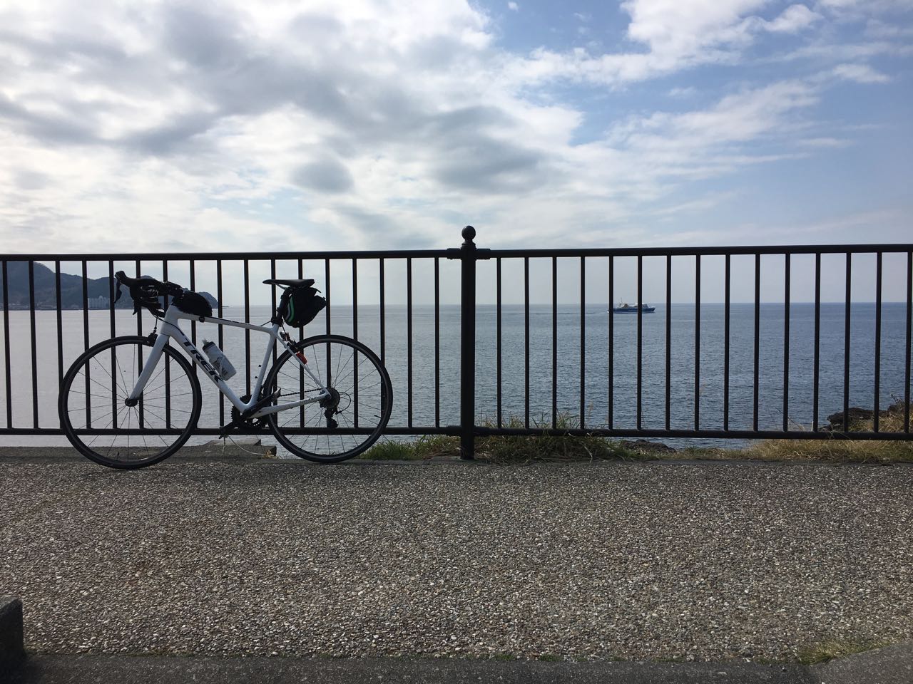 海まで下りて平地を走っているところで、船と富士山のコラボ写真をパシャり。