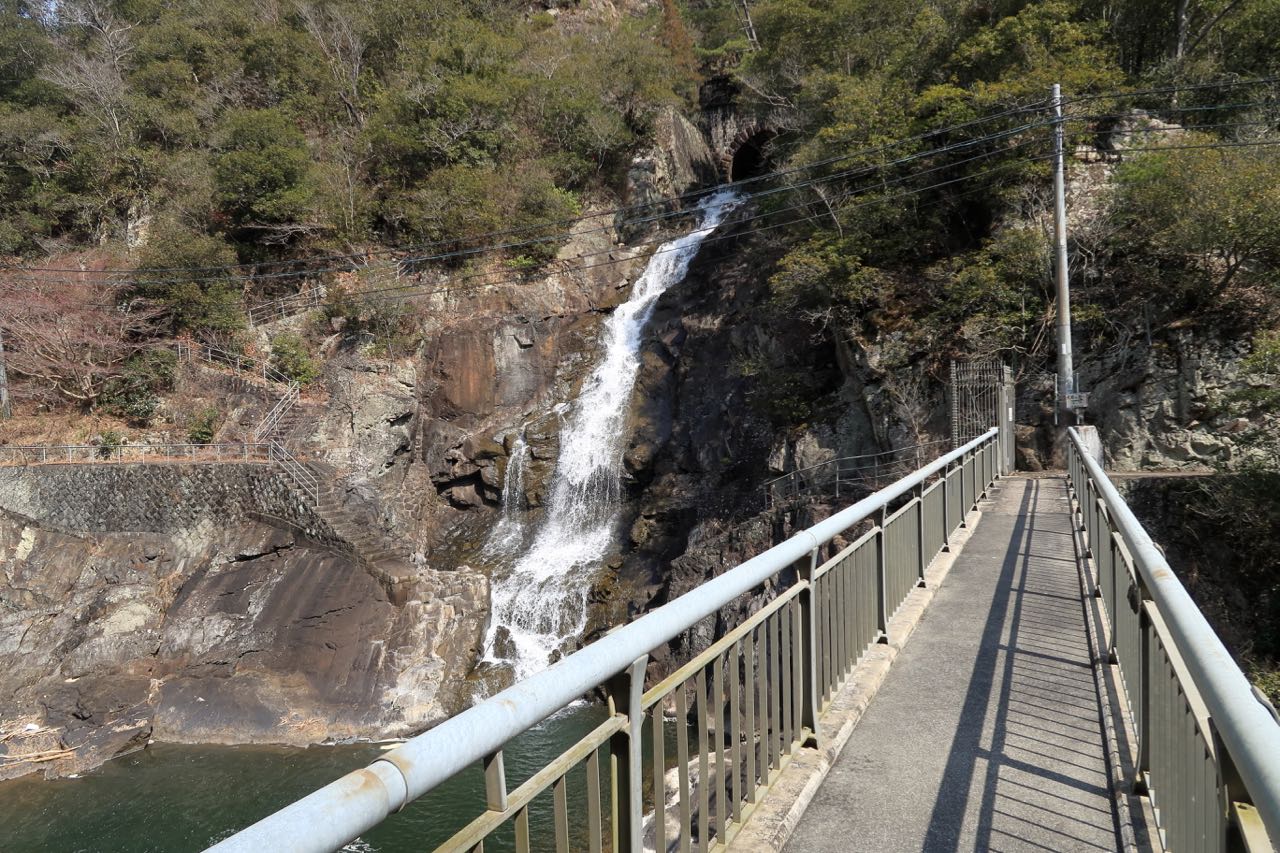 青野ダム記念館の手前にある橋から見た風景。左側の樹木が白いのはなぜだろう?