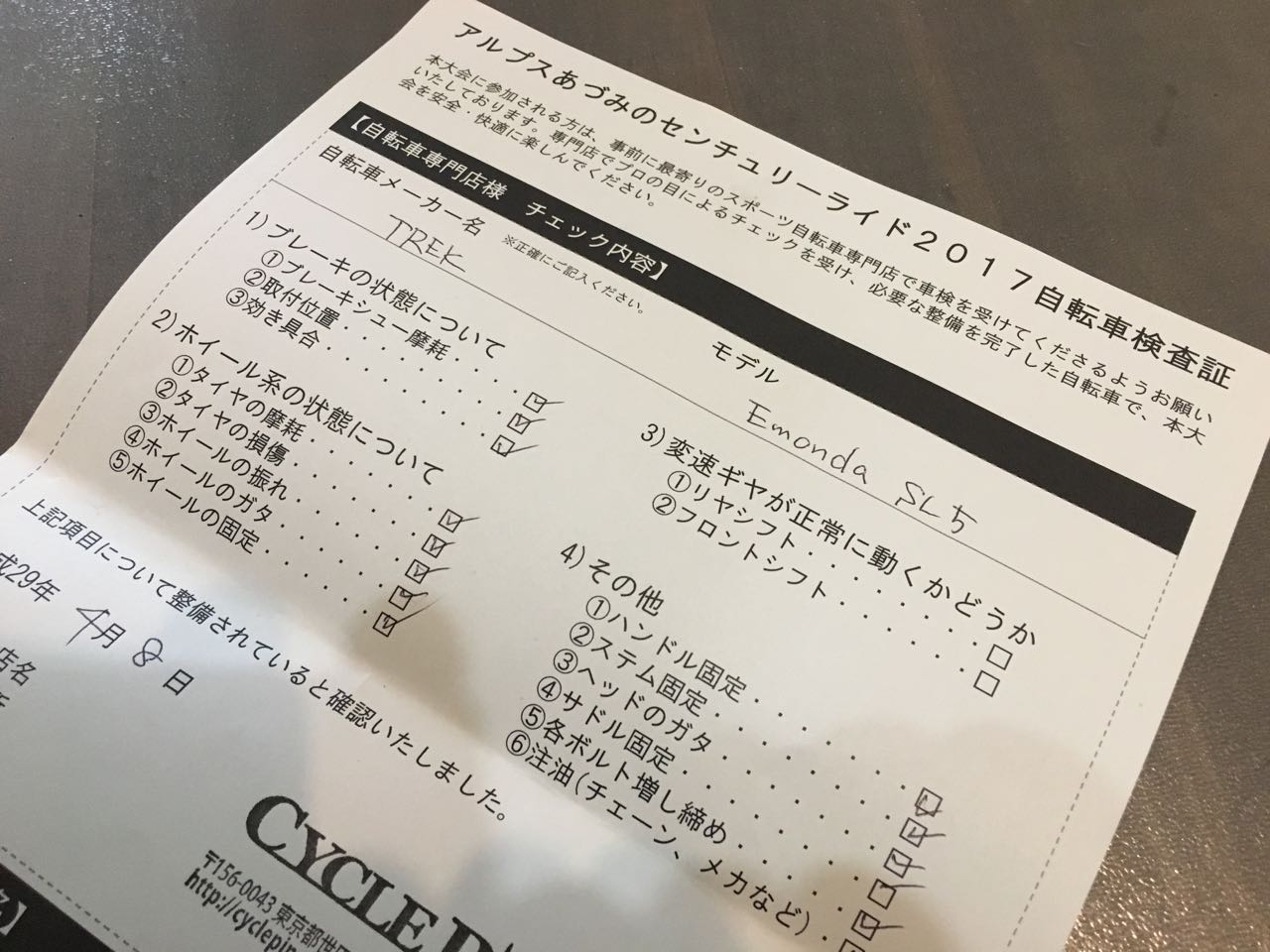 このイベント、出場にあたって "自転車検査証" を提出しなけれならない。専門店でプロの目によるチェックを受け、ハンコを押してもらった書類を提出することになっているのだ。
