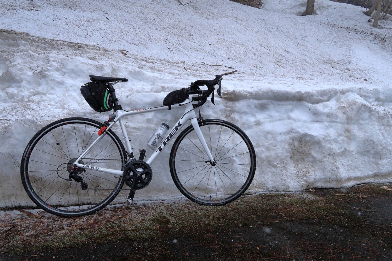 Uターンして、下りはじめる。標高 750m で気温は 1 ℃。雪が舞う中を自転車で下るのはなかなか厳しい。少しスピードが上がるだけで、もう吹雪の中を走っているようなもので、ぜんぜん前が見えないし、ブレーキを握る手が痺れてくる。私の装備で平気なのは 5℃ ぐらいまでだし…。