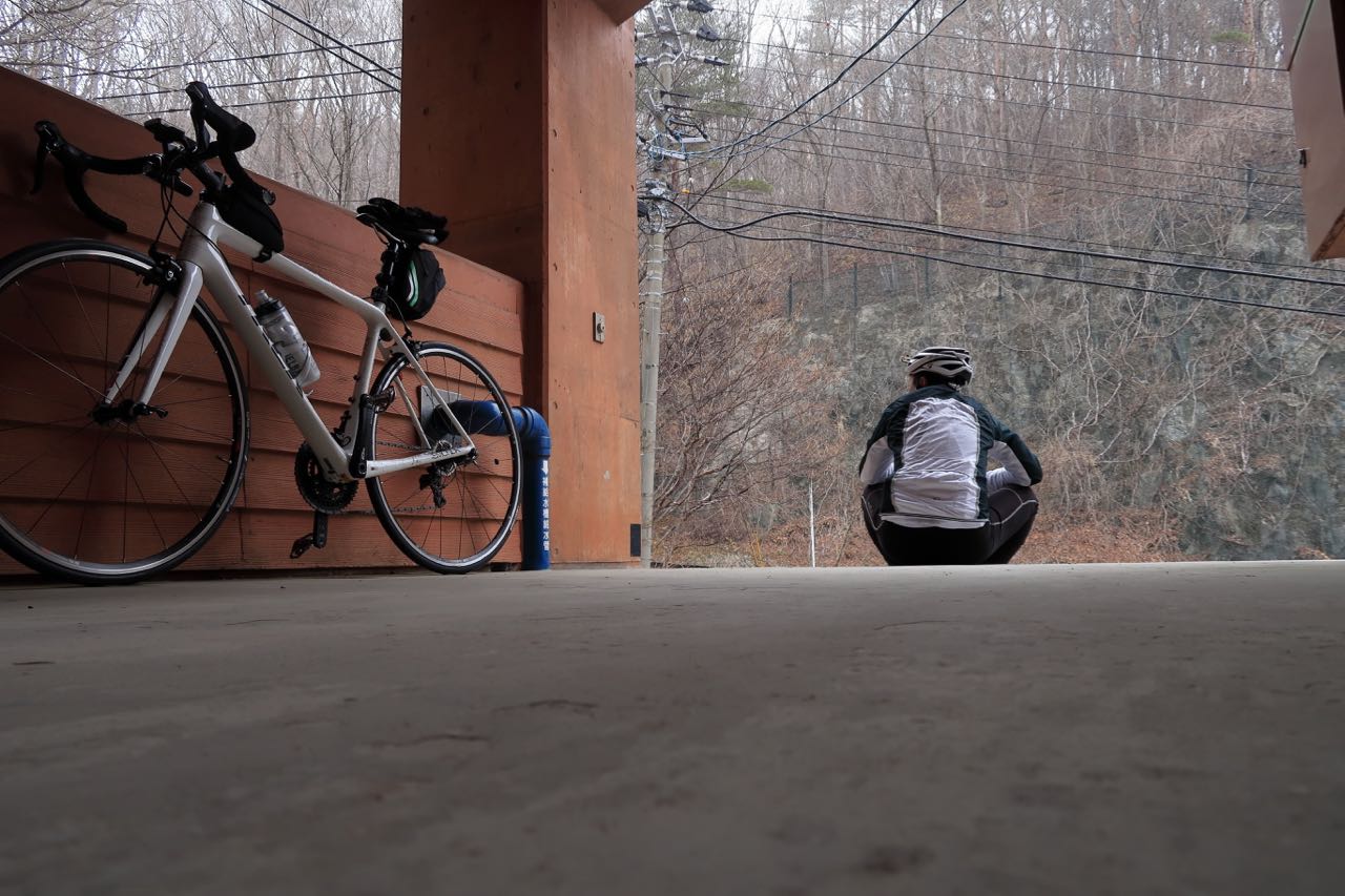 カーブを曲がると、遠くにガードマンが見えた。ヒルクライム中なので、あんまり思考が働かない。きっと「お気をつけて!」と言われるんだろうなぁ〜と、のほほ〜と考えていた。途中で降り出した雨は、すでに雪へと変わっている。