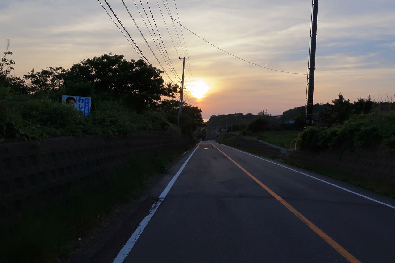 街中を通り過ぎ、海岸線に出た。眩しく輝く夕日に迎えられて、もうすぐゴールだ。